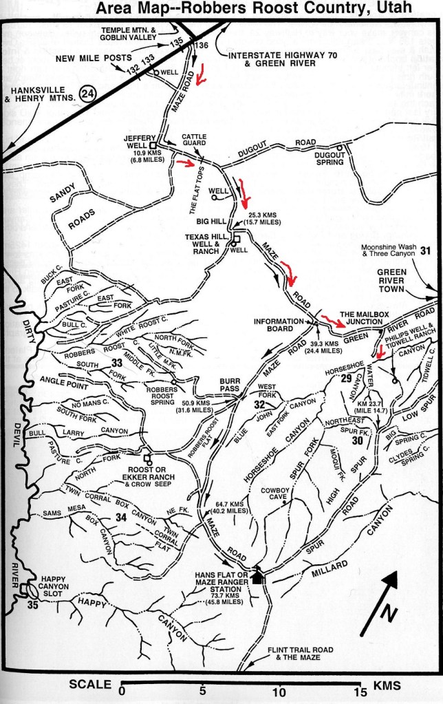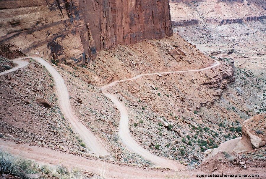 After lunch, and returning the bike rentals, I decided to take my group into the heart of Canyonlands National Park by driving the vans up Shafer’s Trail. To get there, from Moab, Utah we headed north on Highway 191. Then, we turned left on Potash Road\ Highway 279. We continued south on this road for about 25 km until the pavement ended. That is where the 4WD Shafer trail/road started. Shafer Trail Road-Shafer Canyon Road is a 26 km dangerous dirt track into the Canyonlands National Park Gate.