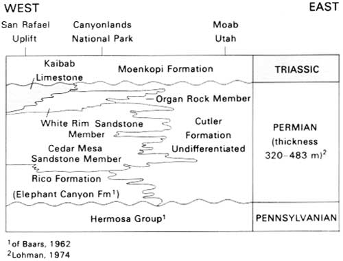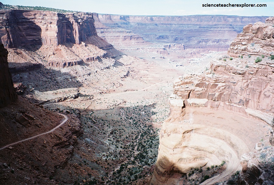 Pictured above, the Shafer Trail connects with the White Rim Trail, which, as the name suggests, is built mainly on the White Rim, after which the White Rim Sandstone was named. The White Rim Trail can be followed northeastward to join the pavement at Potash, or it can be followed southward along the Colorado River canyons to Junction Butte, thence northward along Stillwater and Labyrinth Canyons of the Green River to and beyond the northern boundary of the park.