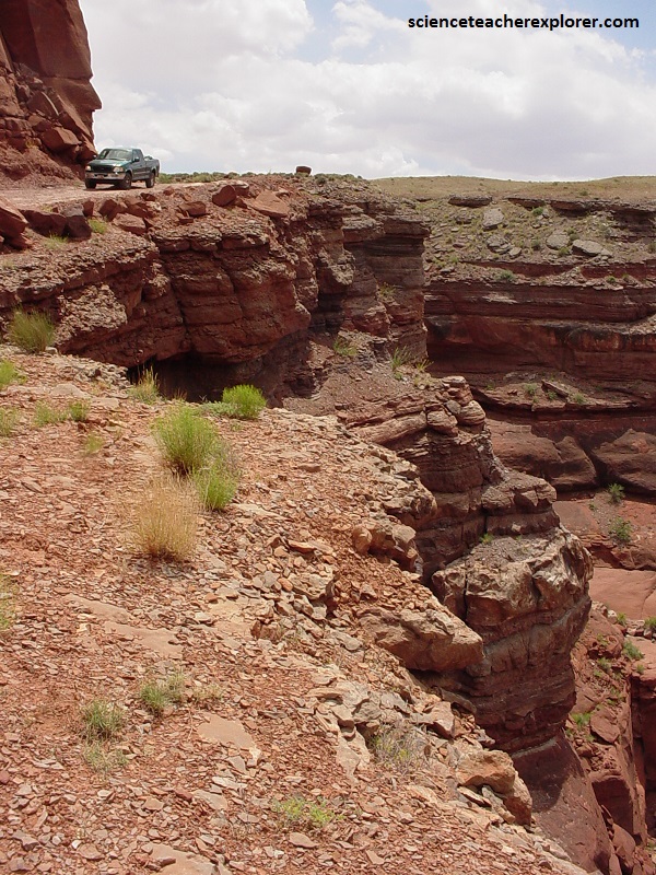 The Shafer Trail provides access to the White Rim Trail as well as other areas in the park and is perhaps one of the most challenging journeys through the park. Although the road has been greatly improved by the National Park Service, the Shafer Trail is still extremely steep and it travels along the tops of sheer cliffs, (pictured above and below).