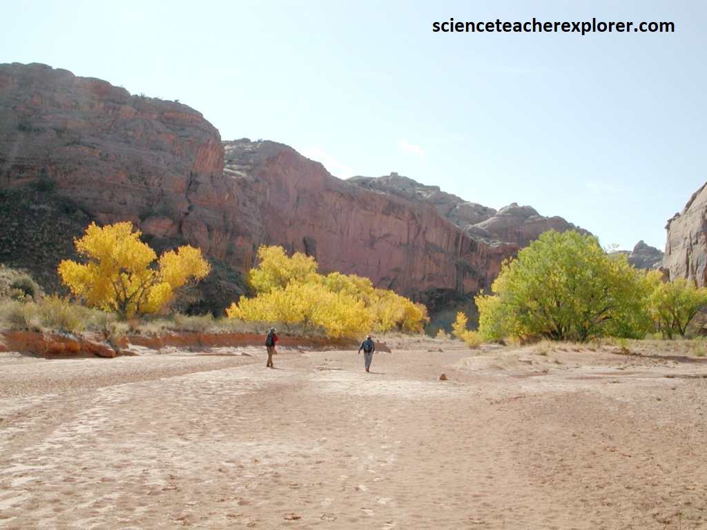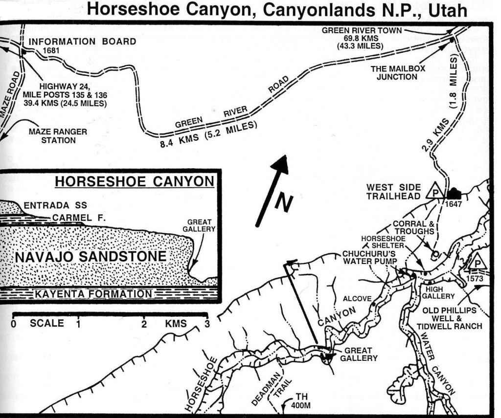 A western-offshoot of the Canyonlands National Park, is Horseshoe Canyon. I trekked it with an ex-student, (Richard Fillerup), in the Fall of 1999. To explore it from the eastern side of the park, drive north on US-191, then west on I-70 to UT-24 for 72 km. From I-70 on UT-24, drive 40 km. One kilometer beyond the turnoff to Goblin Valley State Park, turn left on a graveled road towards the east for Roost Flats and Hans Flat Ranger Station. After 39 km, turn left at the fork to Horseshoe Canyon. Another 8.2 km, is another smaller dirt road that turns right to the Horseshoe Canyon Trailhead. Follow this road for 2.9 km & park.