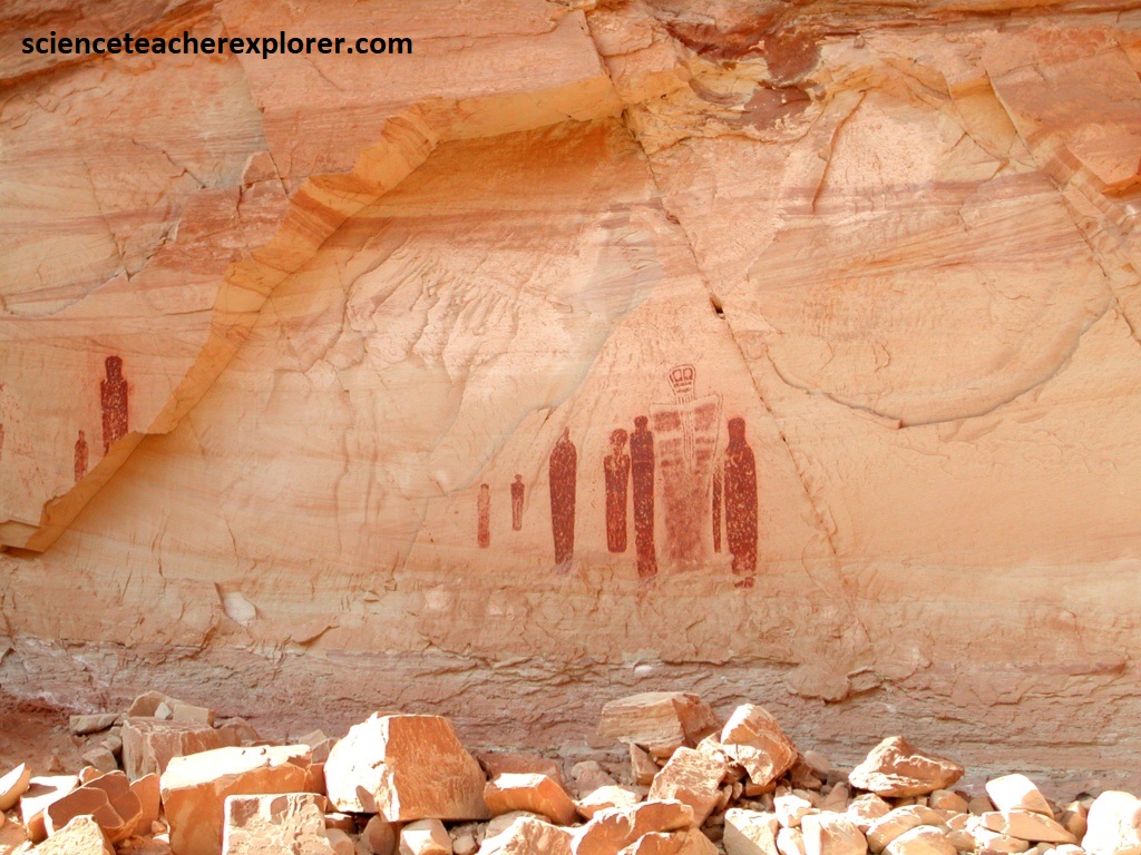 For years archaeologists have struggled to interpret the strange anthromorphs that are depicted on the Great Gallery. In addition to many smaller figures, the huge panel contains about 20 life size human shapes, all of which have a strange mummy-like appearance. They lack arms or legs, and often have huge insect-like eyes and bucket-shaped heads. Most intriguing of all is the figure known as the “Holy Ghost”. This 2.3m high painting stands out among the others because of it’s size and its ethereal appearance. Perhaps it was intended to portray a revered ancestor, or a mythical deity, (pictured above).