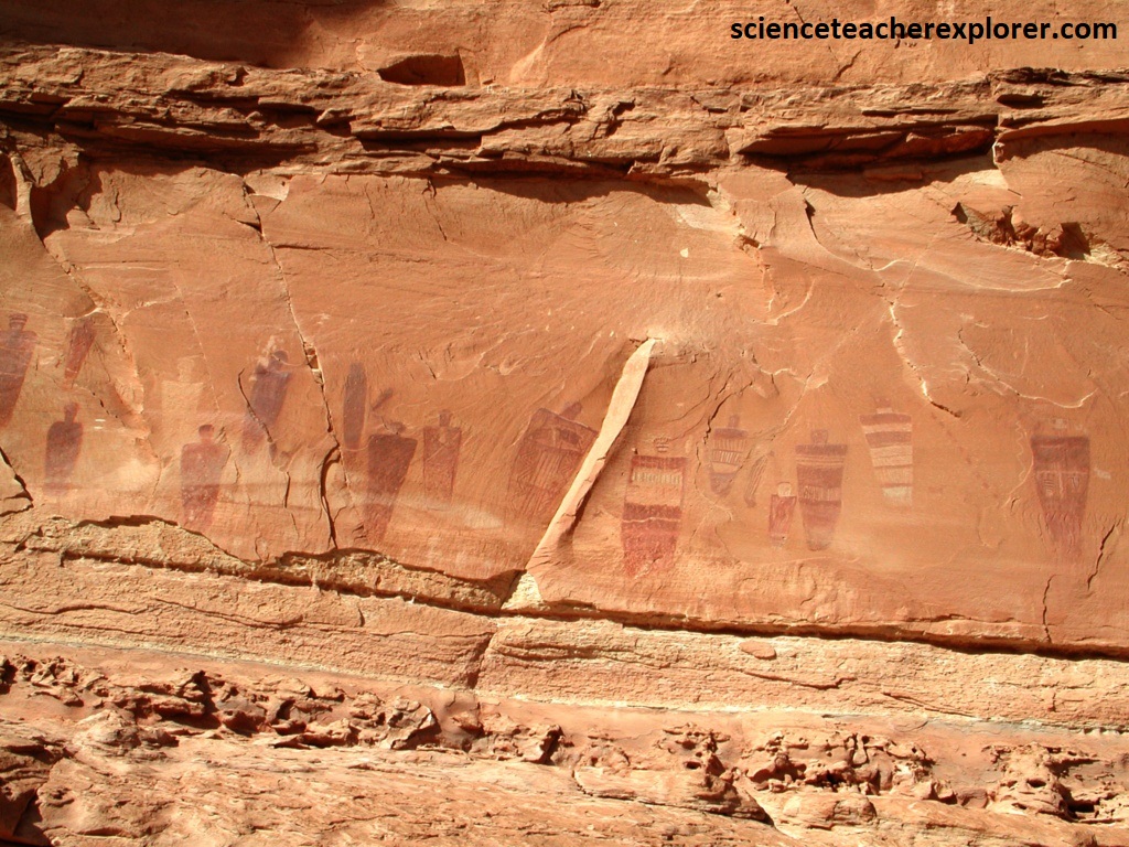 Trekking up the Horseshoe Canyon for about 3 km from the bottom, we came upon the Great Gallery. This display of rock art had ben called the Louvre of the Southwest, and indeed, it is a phenomenal relic of the past. Dozens of intricate human and animal figures decorate the panel, mostly in red, with some brown and white. The pigments were made from finely ground minerals, and then mixed with a liquid base, perhaps animal tallow or vegetable juices, to form a crude paint. After thousands of years all traces of the base have disappeared, but the mineral coloring still adheres to the rock and the paintings remain preserved in astonishing detail.
