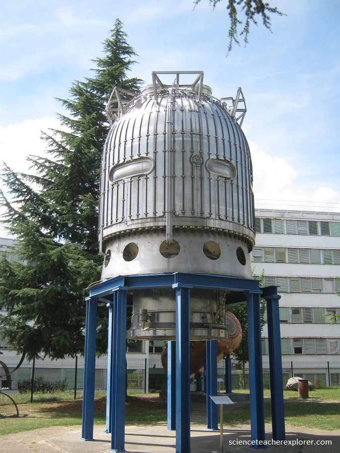 Not a moon Lander, but a particle detector. The 26-ton Big European Bubble Chamber (BEBC), filled with 30 cubic meters of liquefied gas, recorded the interactions of elementary particles. The sensitivity of the liquid gas was controlled by a huge piston. Each time the piston expanded, a burst of particles was photographed. Operational from 1973 to 1984, BEBC produced 3000 kilometers of film.
