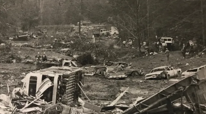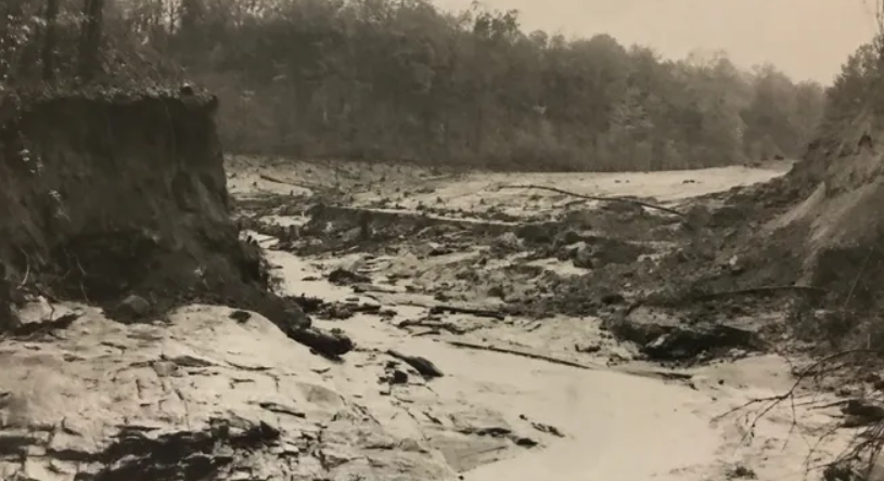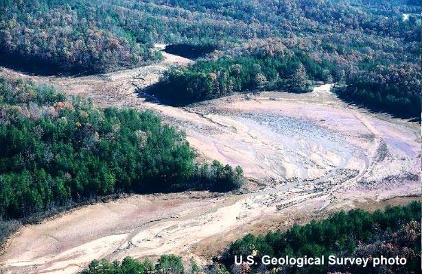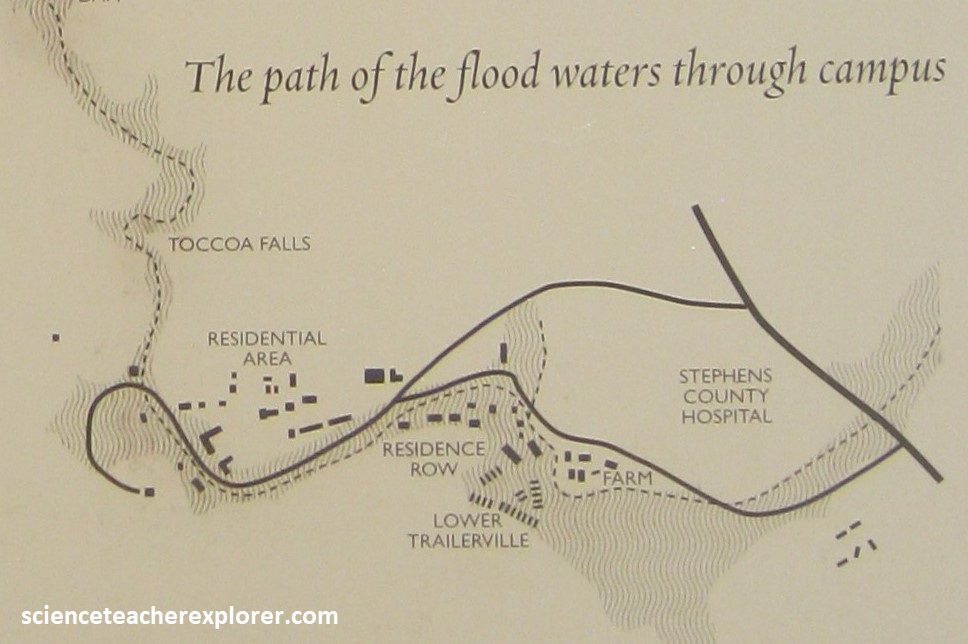 [Pictured above are public domain images (from the USGS), of the results of the 1977 dam-failure at Toccoa Falls, Georgia]