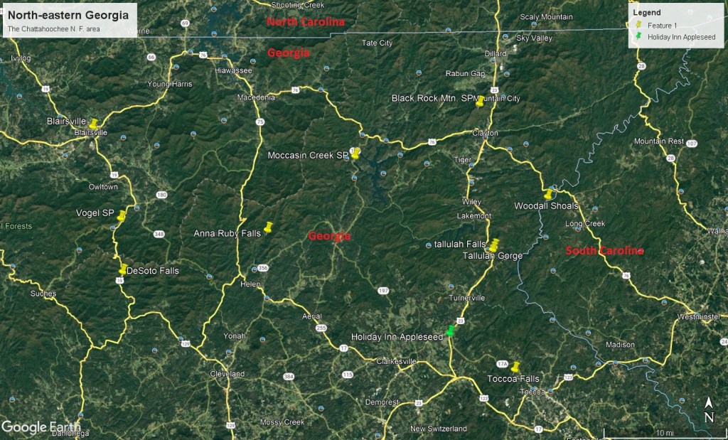 The Chattahoochee National Forest is located in the mountainous region of northeastern Georgia. We took flight to Atlanta, Georgia. From there we rented a car and drove northeast on Interstate 985 to Gainesville, Georgia.