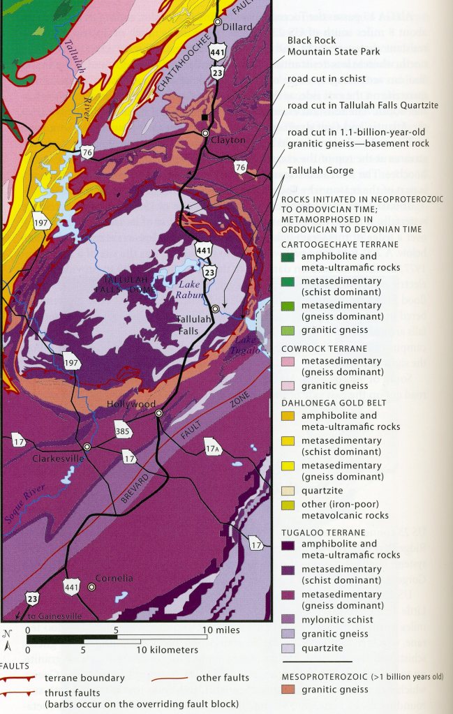 From Hollywood, Becky and I continued driving north up US 23 to Tallulah Gorge State Park. Along the way, US 23 passes onto the Tallulah Falls Dome. Images above, on the geologic map, the dome forms an oval about 27 km long and 18 km wide. Layers of rock around the margins of the oval seem to double back in an intricate maze, like the edges of leaves in a sliced head of cabbage. Notice that surrounding the quartzite dome is a ring of basement granitic-gneiss that lies under the quartzite and older. This rock has been radiometrically dated at 1.1 billion years.