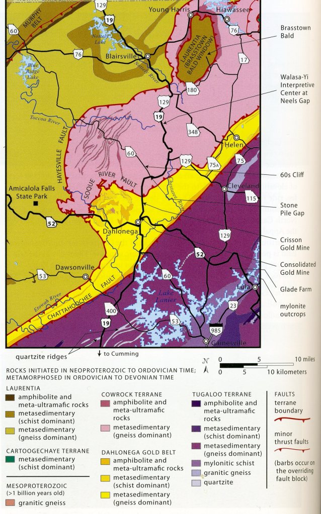 Surrounded at lower elevations by rocks of the younger Cowrock terraine, Brasstown Bald seems to be positioned at the center of a tectonic window. The rocks in this window are part of ancient Laurentia. Apparently, the younger Cowrock terrane was thrust over the older Laurentia rocks, but erosion cut through it and the underlying thrust fault, exposing the Laurentia terrane that makes up Brasstown Bald.