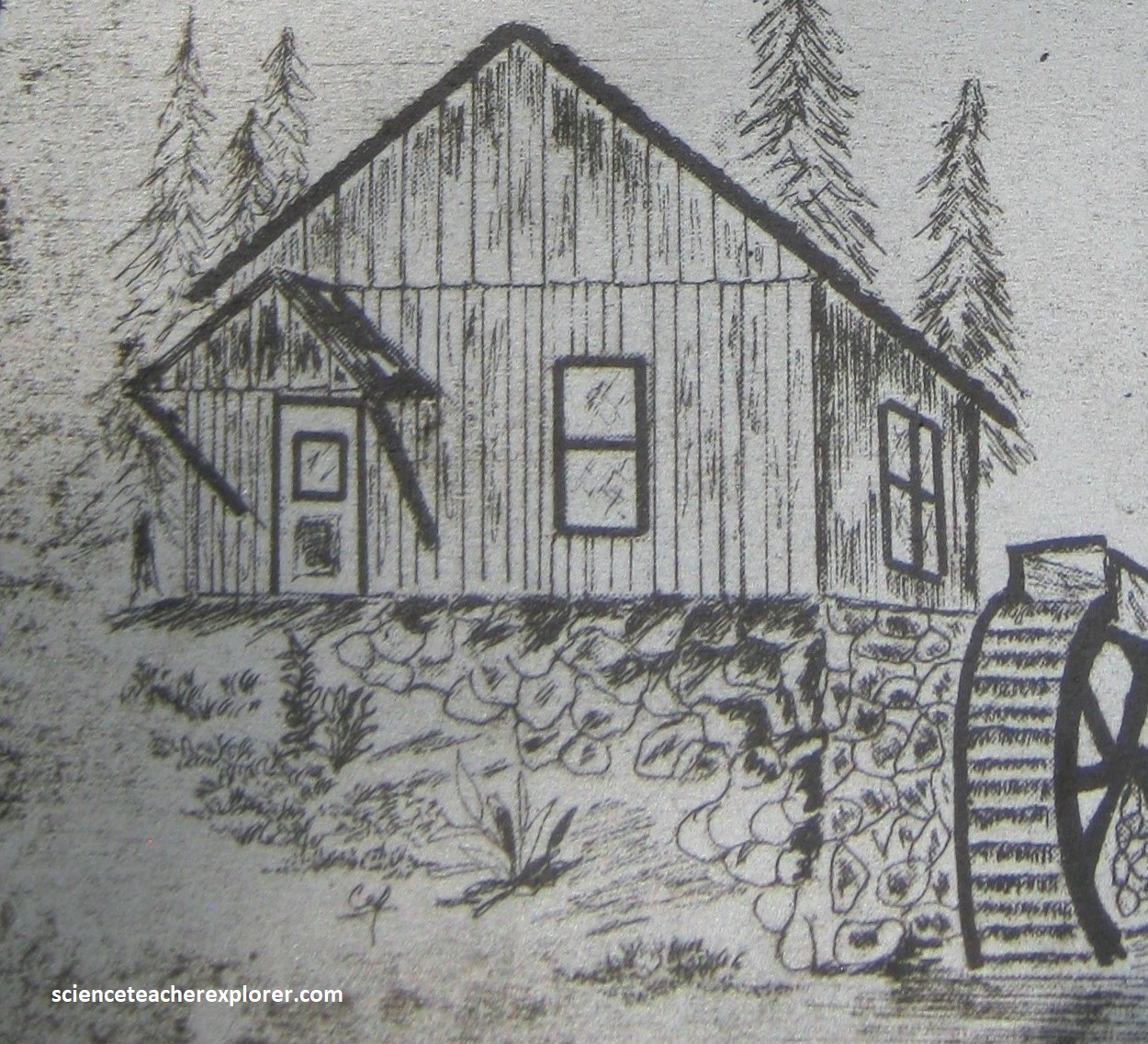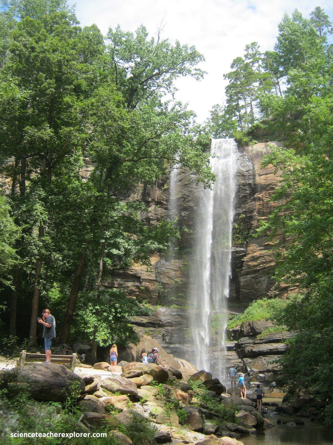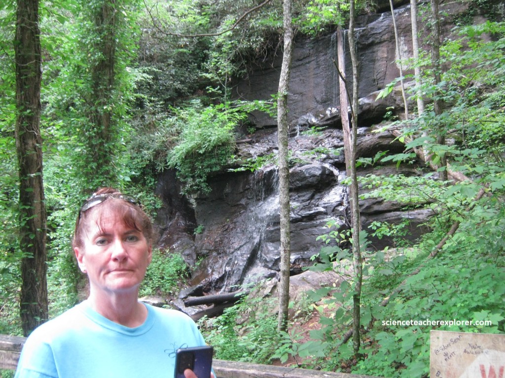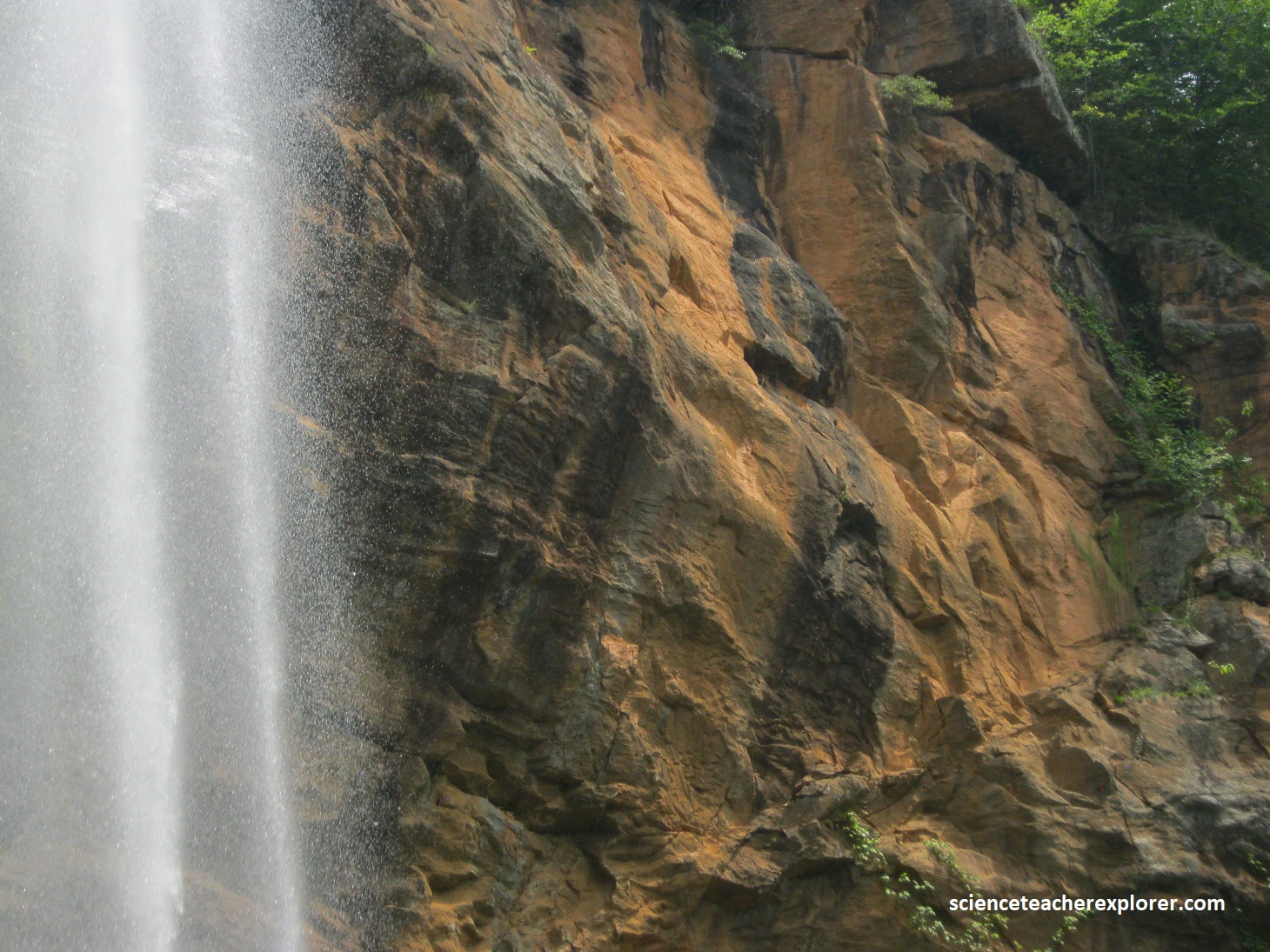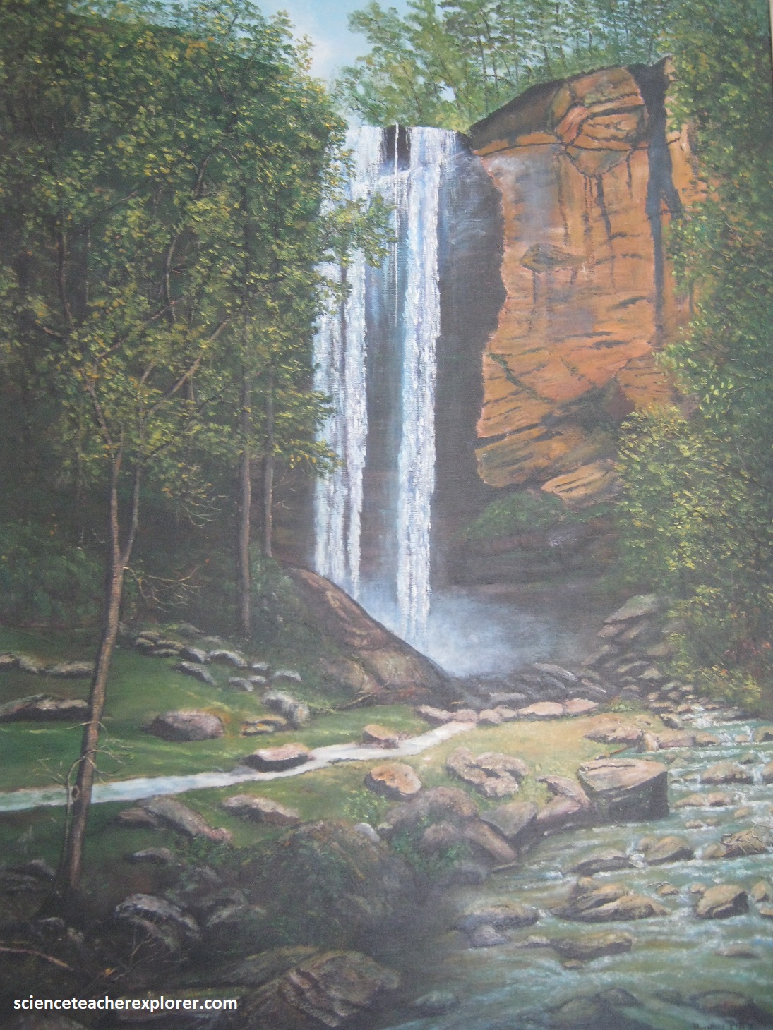 Pictured above, Toccoa Falls, just northwest of Toccoa, is one of Georgia’s most accessible waterfalls, (artist depiction of the falls on the left and Becky studying a map below the falls on the right). It is also one of the most beautiful because of its 62m sheer drop over a ledge of metagraywacke and biotite gneiss to less resistant amphibolite below, (pictured below). A 67m long pathway led to the falls.