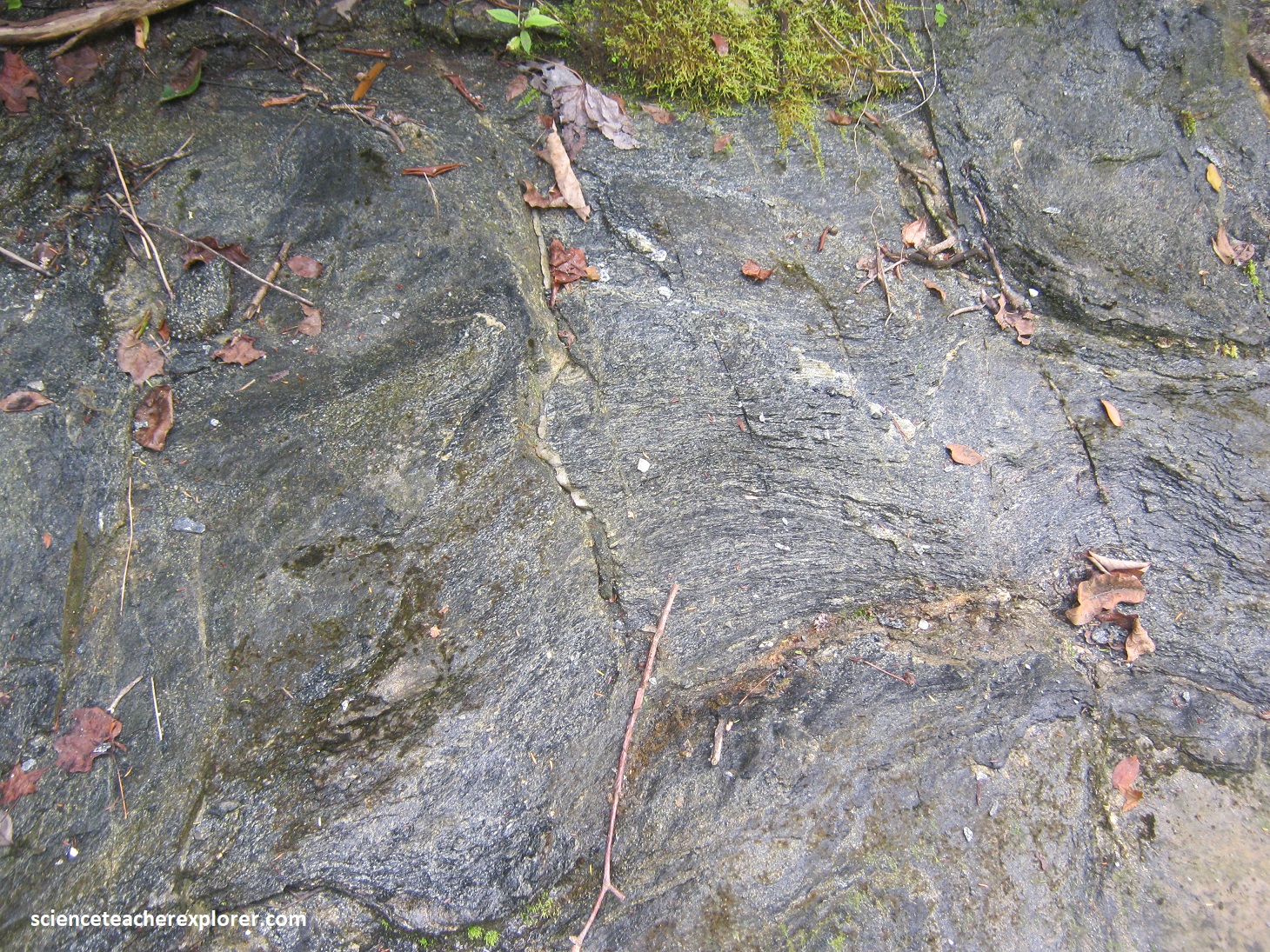 Pictured above, Tallulah Falls Quartzite underlies much of the dome. It is more resistant to erosion than the surrounding rocks and forms the mountainous topography surrounding the town of Tallulah Falls.