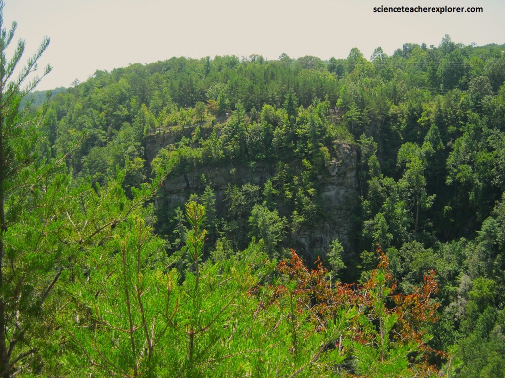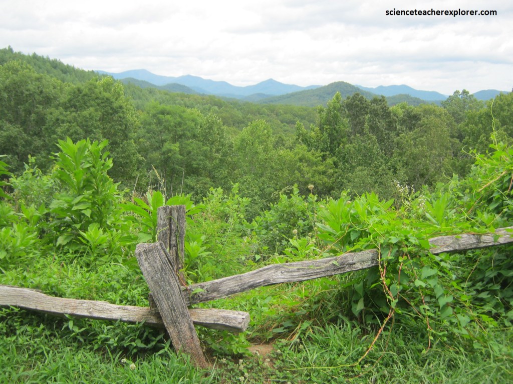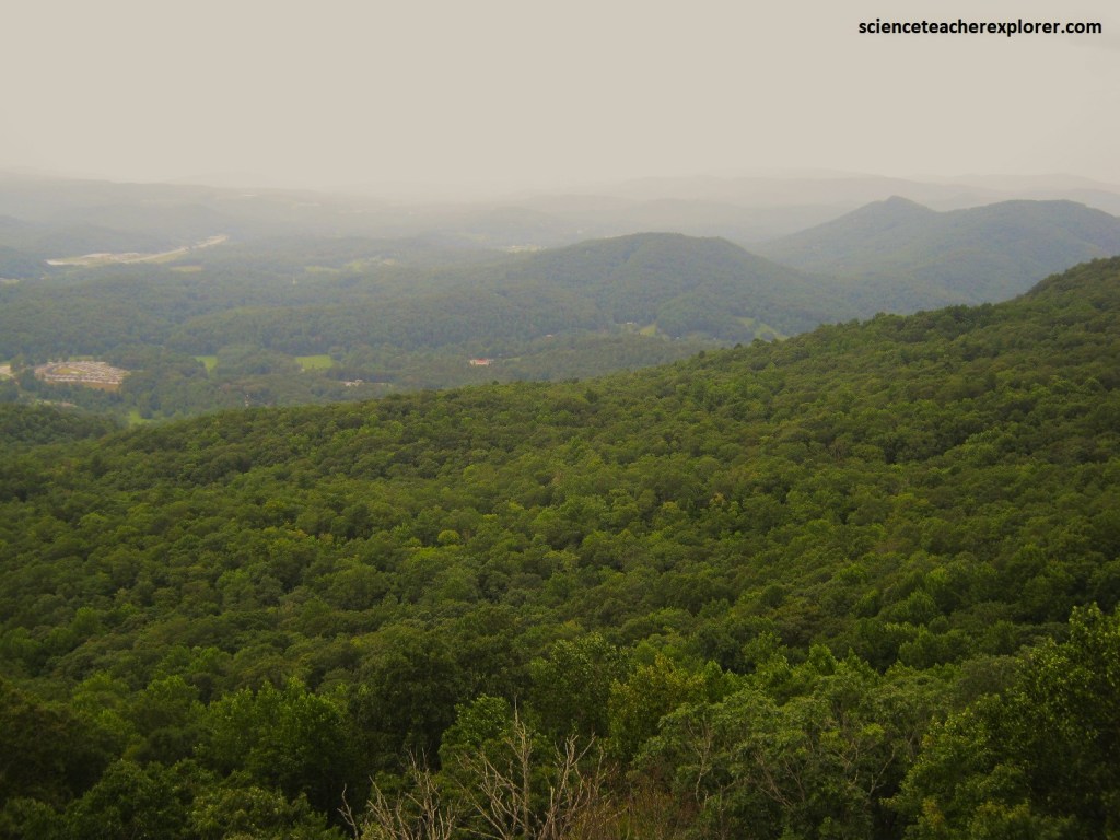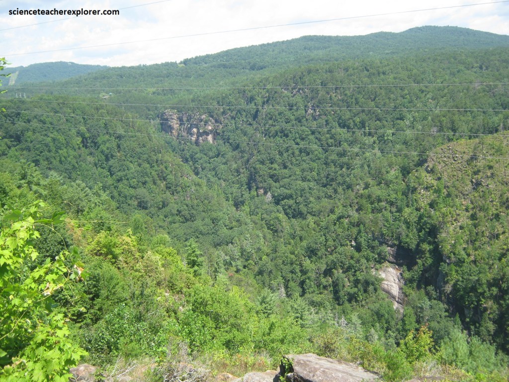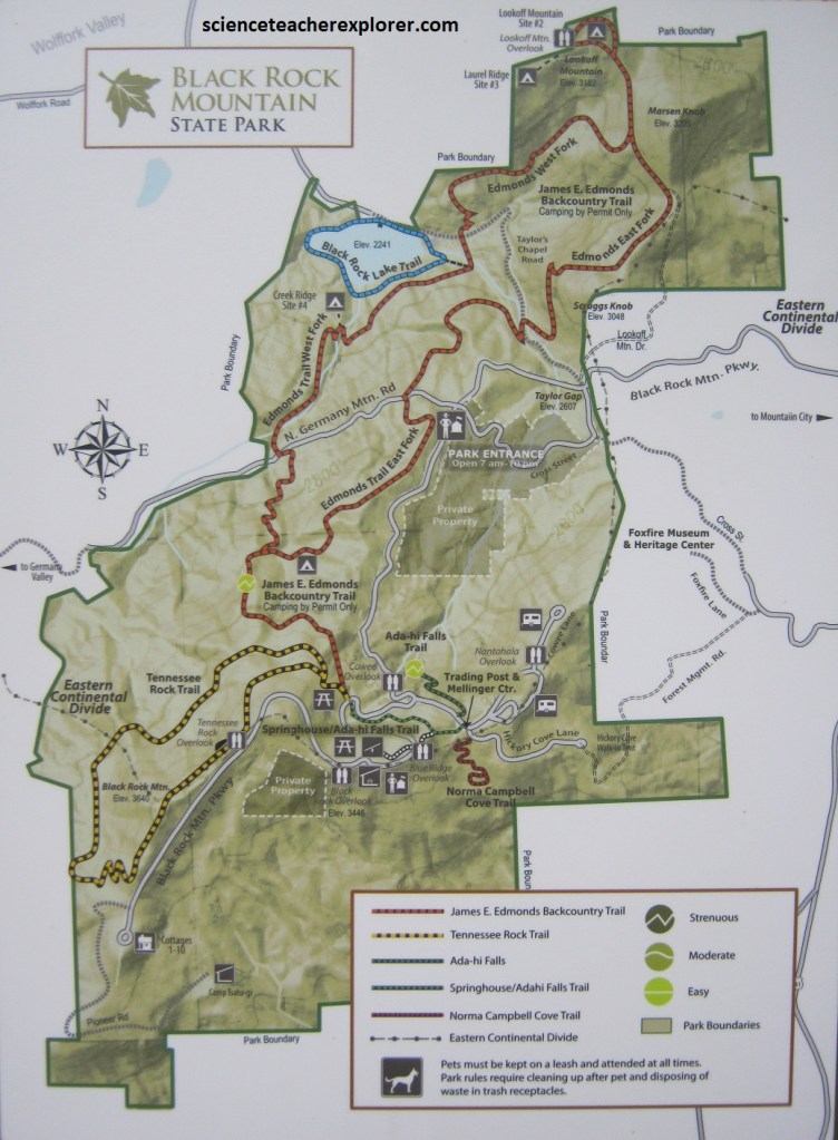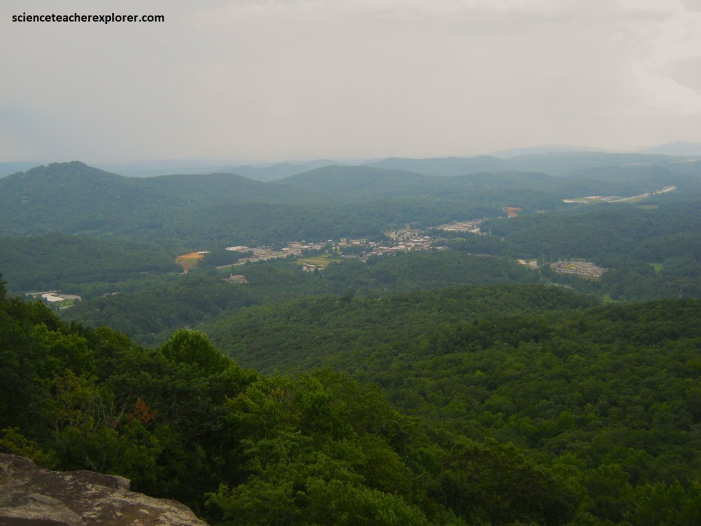 From Tallulah Falls, Becky and I continued driving north on US23, through Clayton to the Georgia/North Carolina border. About 3 km north of Clayton, US 23 passes into darker metasedimentary rocks for which the 1214m Black Rock Mountain is named. Black Rock Mountain State park is Georgia’s highest state park, (imaged below).