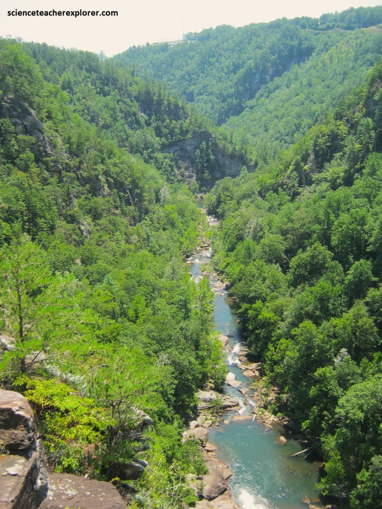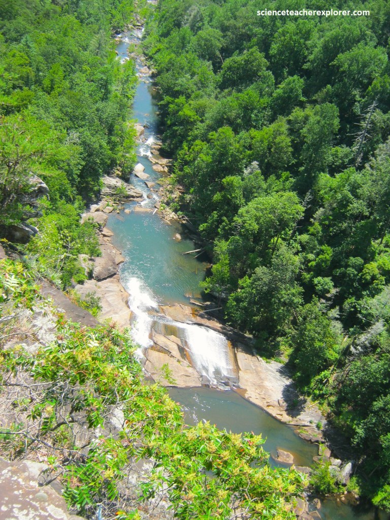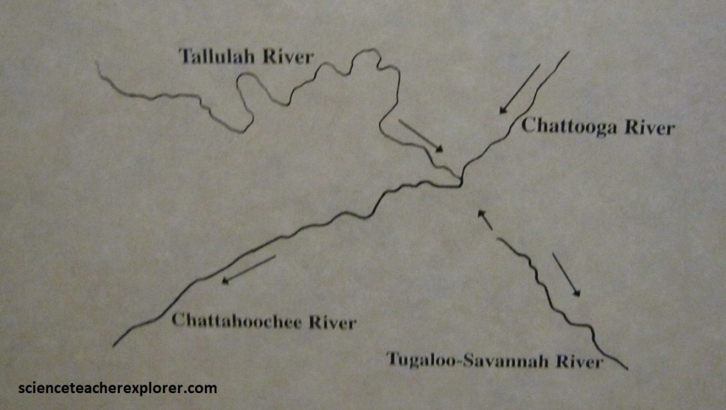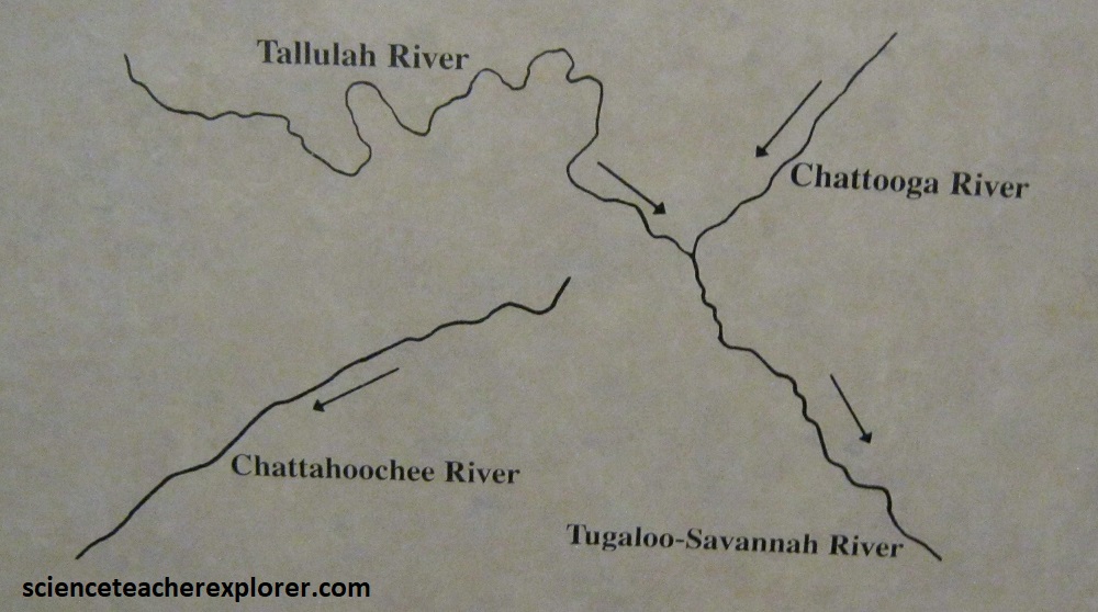 Pictured above, the exceptional narrowness of Tallulah Gorge and the steepness of its walls suggest that the gorge was cut relatively recently. The steep-walled gorge is likely the result of a stream capture event. The Chattahoochee River basin and the Gulf of Mexico would have been the previous recipients of the waters of both the Tallulah and Chattooga rivers, (imaged below).