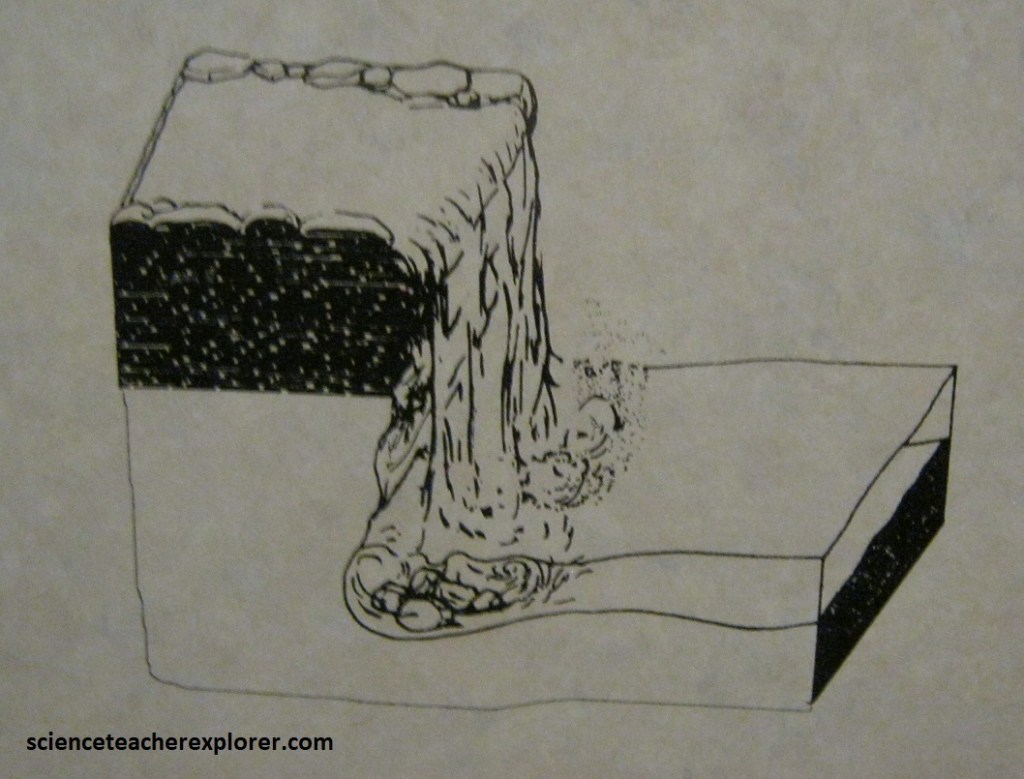 Pictured above, the Tallulah, strengthened by its decent into the Savannah, cut more deeply into the quartzite, (carving the gorge with greater speed). Waterfalls became a major way the river cut the gorge. A waterfall moves backward by undermining the caprock (rock surface of a riverbed) which eventually collapses, and the process starts over.