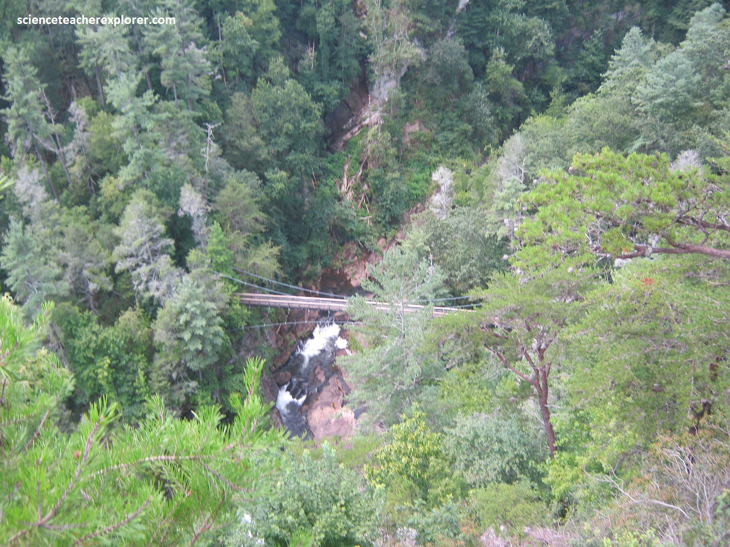 Overlooks, by the interpretive center, provide a view of 2 waterfalls and access to a staircase that leads to the bottom of the gorge, which is about 117m below. Pictured above, spectacular views reward descent into the gorge, where a swinging bridge crosses the river just above Hurricane Falls. The rocks exposed in the canyon are all Tallulah Falls Quartzite, and the 5 waterfalls flow over especially resistant quartzite ledges.