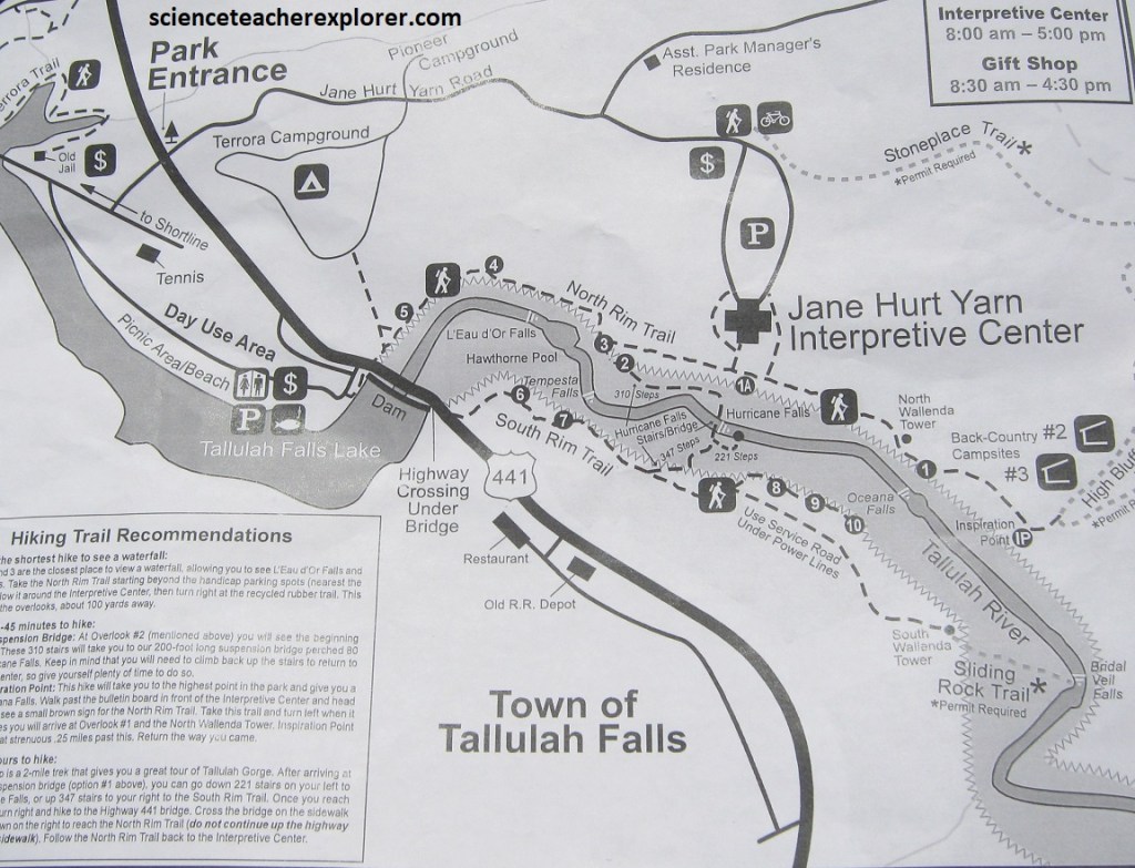 Image above, the entrance to Tallulah Gorge State Park is on the east side of US23, 17 km south of Clayton. The Jane Hurt Yarn Interpretive Center, with trail access to overlooks and displays on geology, ecology, and history, is 1.6 km from US23.
