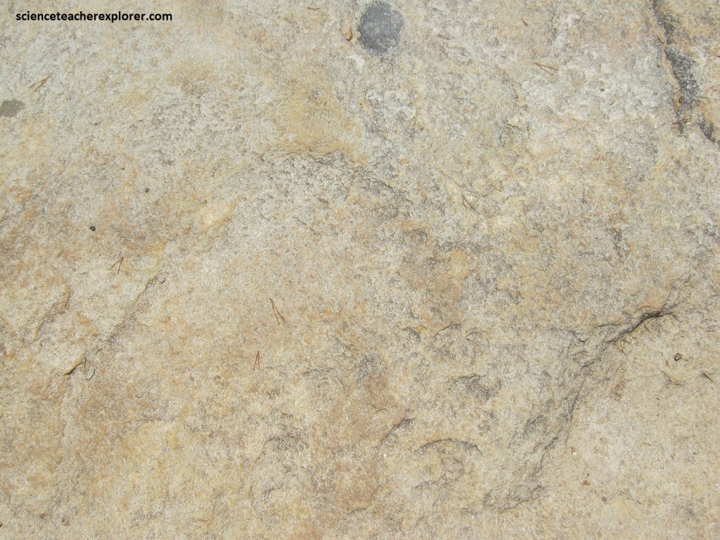 This quartzite is a salmon colored rock, with little obvious layering, cut by whit pegmatite dikes, about 10cm thick. The quartzite was once sand deposited along a coastline as rising sea-level gradually flooded the deeply eroded, old landmass Laurentia (the basement rocks of granitic gneiss). The sand later became quartz sandstone, then metamorphic quartzite. The Tallulah Falls Dome example is a bit unusual because the basement rock layer is only 100m thick and occurs around the edge of a much thicker body of quartzite. Usually it is reversed. However, it may be that only a sliver of basement was brought to the surface on a thrust fault.
