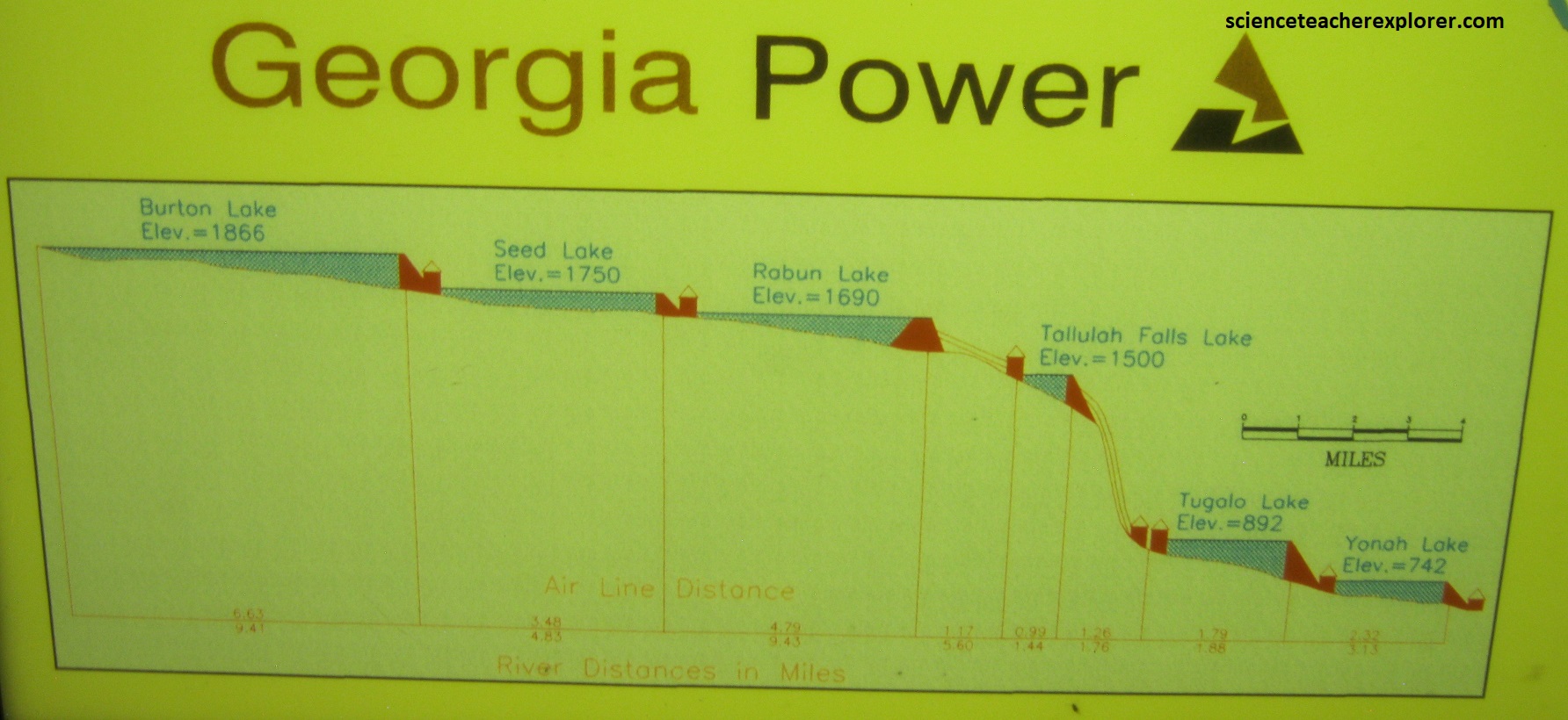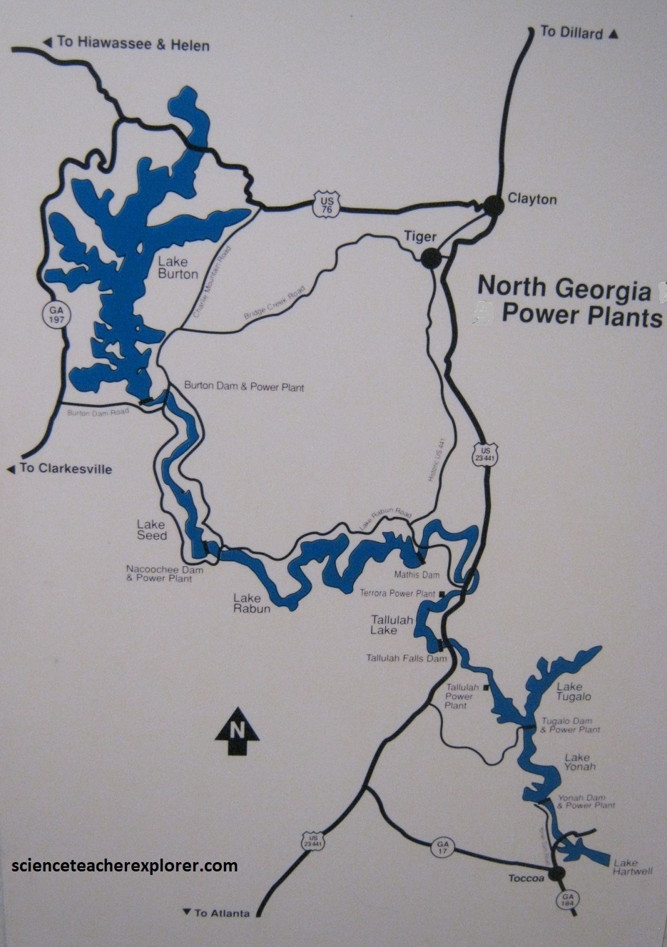 Pictured above, Lake Burton was constructed in a deep valley located along a 16 km section of the Tallulah River. With the introduction of hydroelectric power to America in the 1880s and due to the fact that the Tallulah River has the greatest verticality of any river in the east, a series of six stairstep dams was constructed in the period 1914–1927 over a distance of 28 miles. Lake Burton, being the largest and highest of the lakes, was intended to be the primary reservoir for the water needed to power the turbines downstream. This North Georgia Hydro Project was one of the first large, integrated hydroelectric systems to be built in North America. The electricity it provided would begin Atlanta’s growth into the economic metropolis it is today, (imaged below taken from an interpretive sign at site).