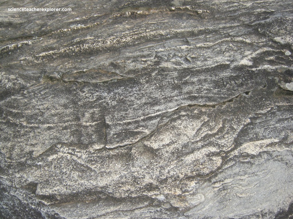Pictured below, we could see an outcrop of biotite gneiss, showing the effects of multiple folding episodes, at Black Rock Overlook, adjacent to the visitor center.