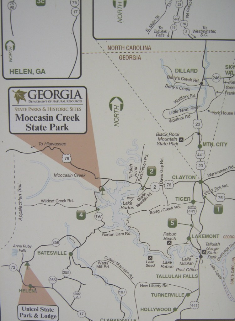 From the entrance to the Black Rock State Park, Beck and I had to back-track south on US 23 to Clayton. At Clayton, we turned west, (left), on US76 to explore the northern regions of Chattahoochee National Forest. We continued to Moccasin Creek State Park, (a pint-size playground that hugs the western shore of Lake Burton).