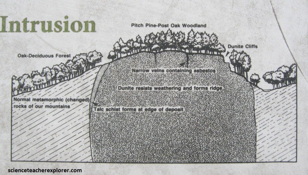 Imaged above, now weathered to a rounded outcrop about 867m x 267m in size, this rock first appeared millions of years ago on the ocean floor as a molten upwelling from the earth’s interior. Composed of the mineral olivine, the Lake Burton Dunite is quite different from the schists and gneisses that make up our mountains. These differences include alkaline rather than acidic soil conditions and low levels of certain soil nutrients. {The plant community was quite unique}.