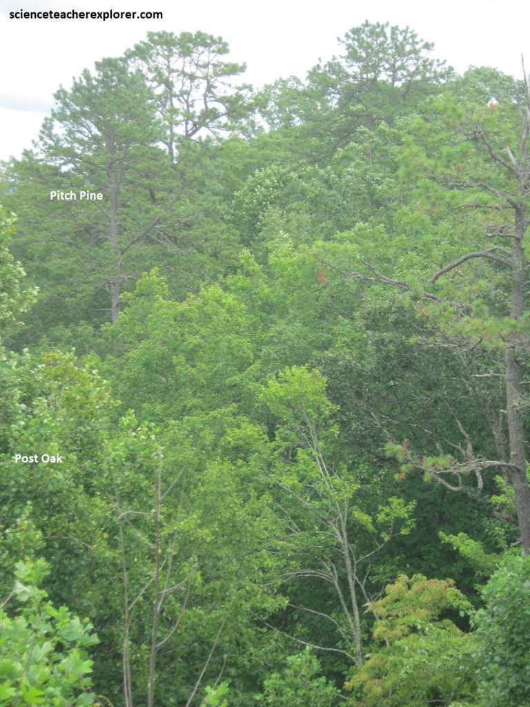 Pictured above, the hilltop vista at the Popcorn Overlook is often called a ‘pine barrens’. Due to the alkaline soil rather than acidic than acidic and lack of potassium, the plant community resembles a wooded prairie dominated by pitch pine, grasses, and post oaks. Acid-loving plants such as laurel, rhododendron, an blueberry, common over most of the north Georgia mountains, are absent here. Other plants on the ground included wintergreen, rattlesnake master, and ninebark.