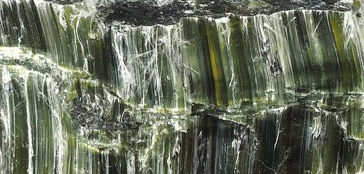Pictured above-left, Dunite is hard, greenish in color, and has several valuable minerals associated with it, such as chromium, nickel, and corundum. Corundum is the source of rubies and sapphires. Across the highway, there were prospecting pits and trenches dug about 1890. Veins of talc and asbestos cut through the dense dunite rock. Pictured above-right; along the old road, bits of asbestos-serpentinite could be found, which closely resembled decayed wood. Dunite broke into fin-grained and sugary particles, while talc and asbestos-serpentinite had a greasy feel.