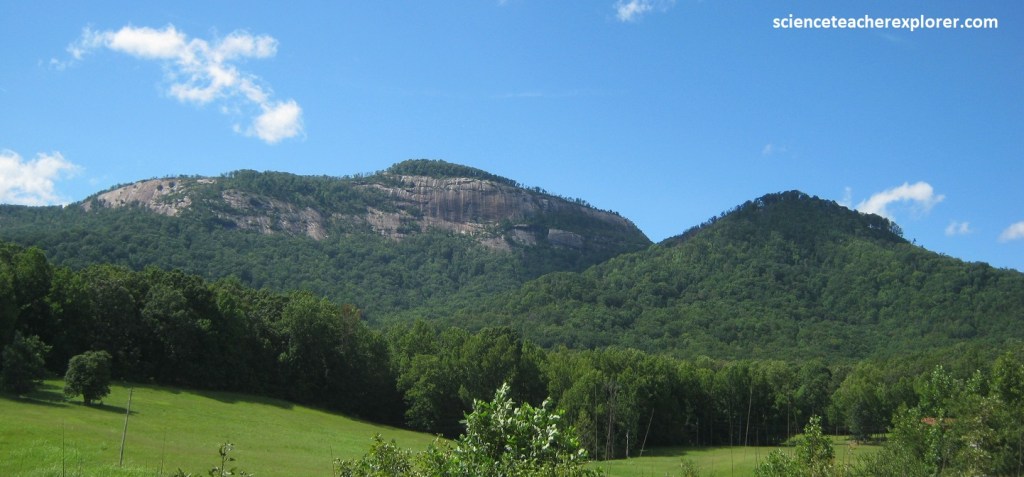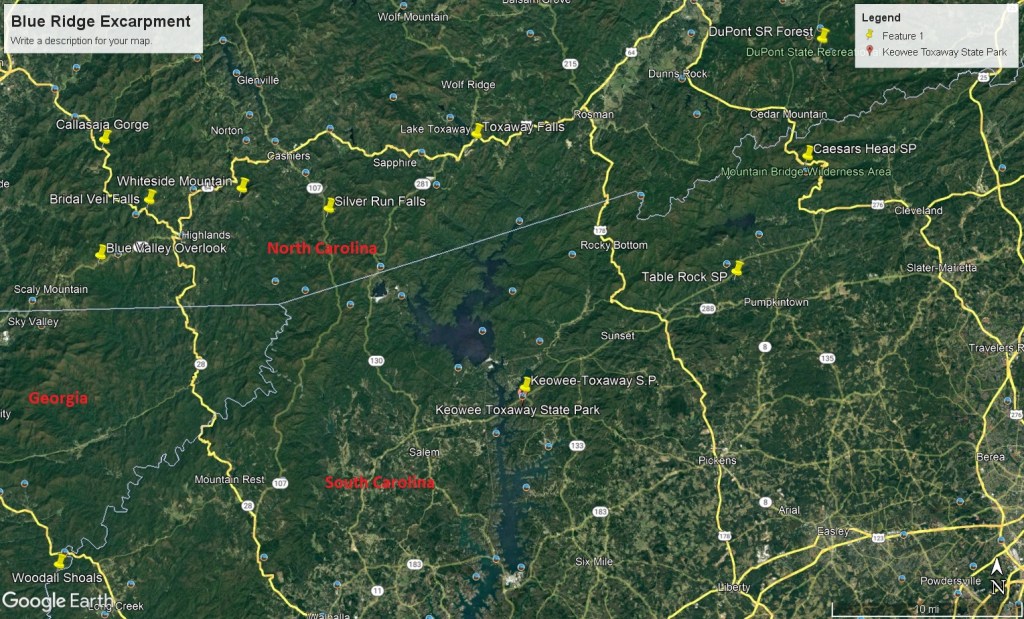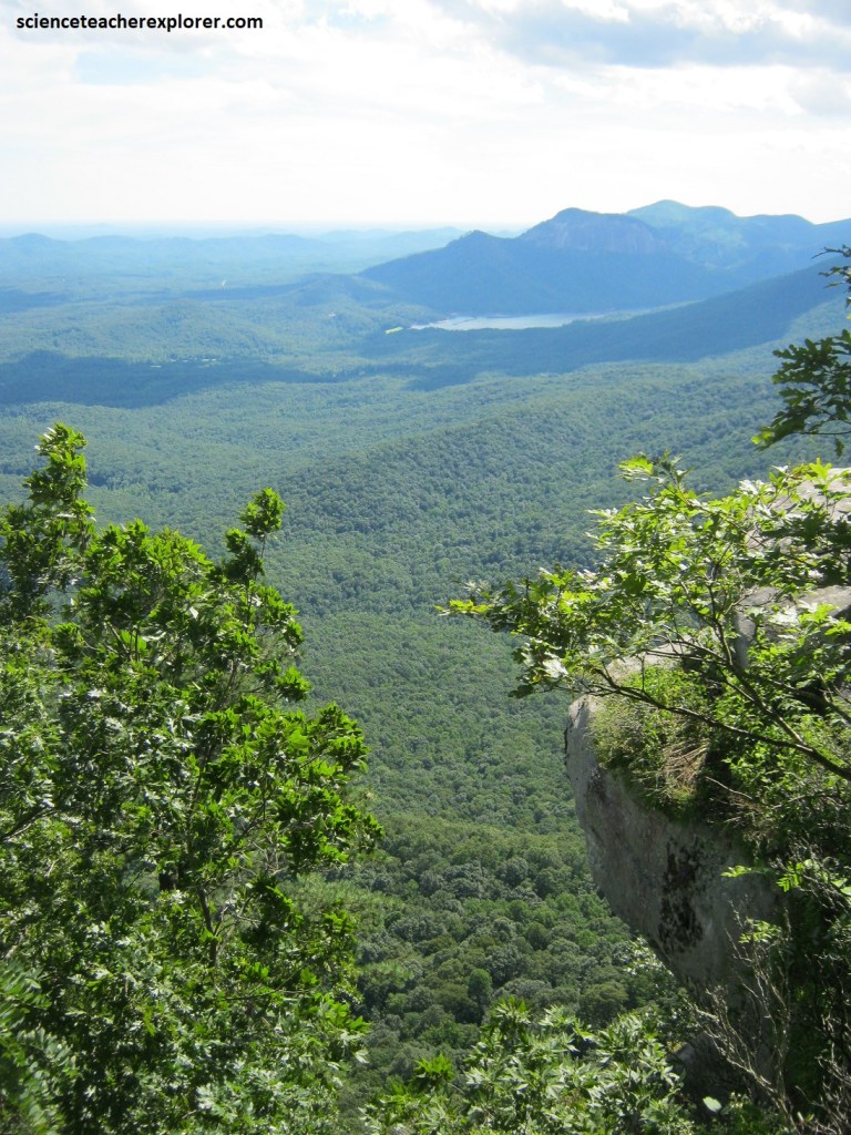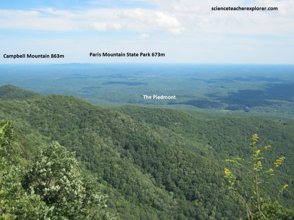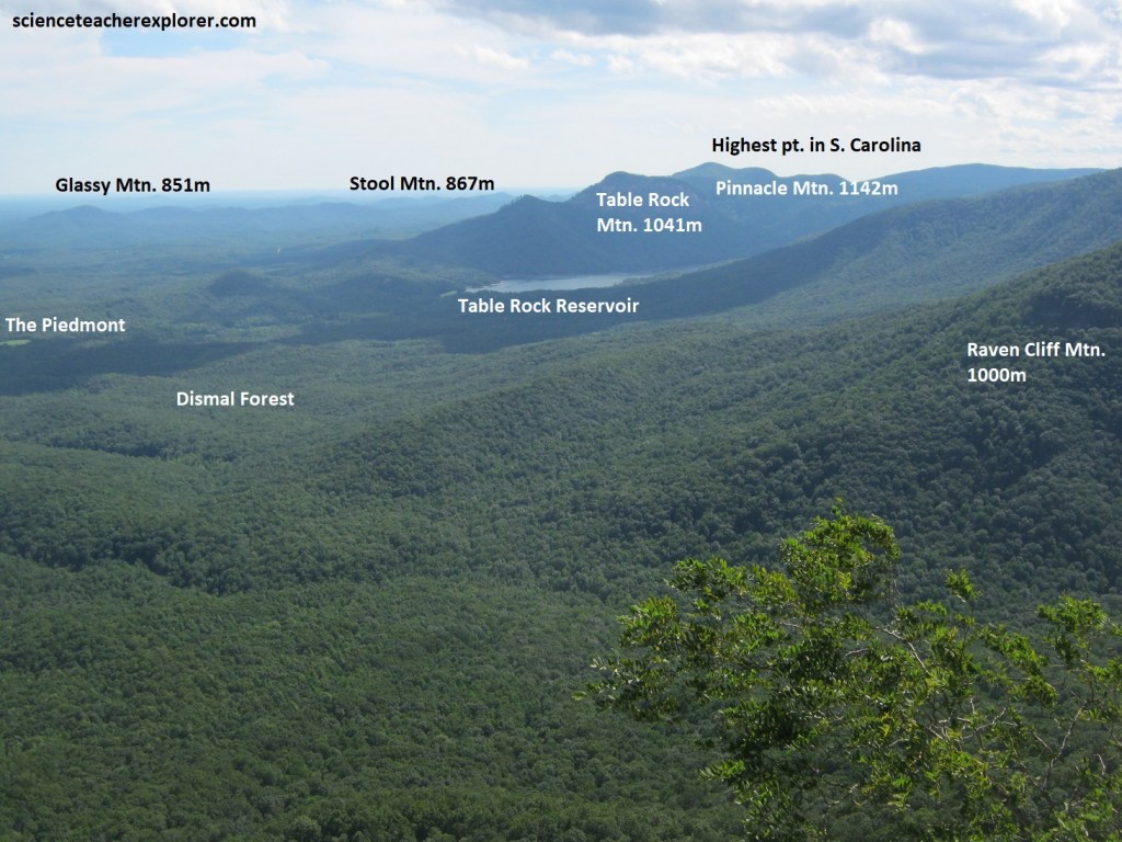At the top of Caesars Head in Greenville County, South Carolina, we were standing on a cliff 1089m above sea level with a view on the edge of the Blue Ridge escarpment, (the topographic divide-line between the Piedmont and Blue Ridge). Pictured above, this escarpment is an abrupt change in elevation of up to 667m that runs from Virginia through North Carolina into South Carolina. In some places, such as Caesars Head, the escarpment is essentially vertical. In other places, it is not a cliff, but rather a steep slope.