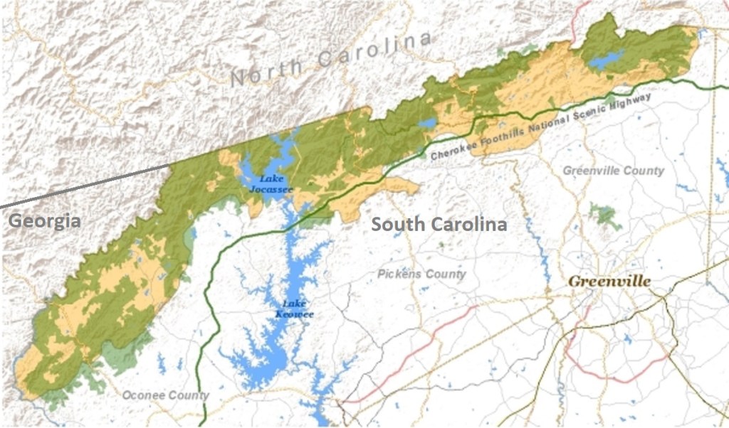 The Cherokee Foothills Scenic-Byway climbs across the slopes of the Blue Ridge foothills, forming a 209 km arc in the northwestern part of South Carolina.