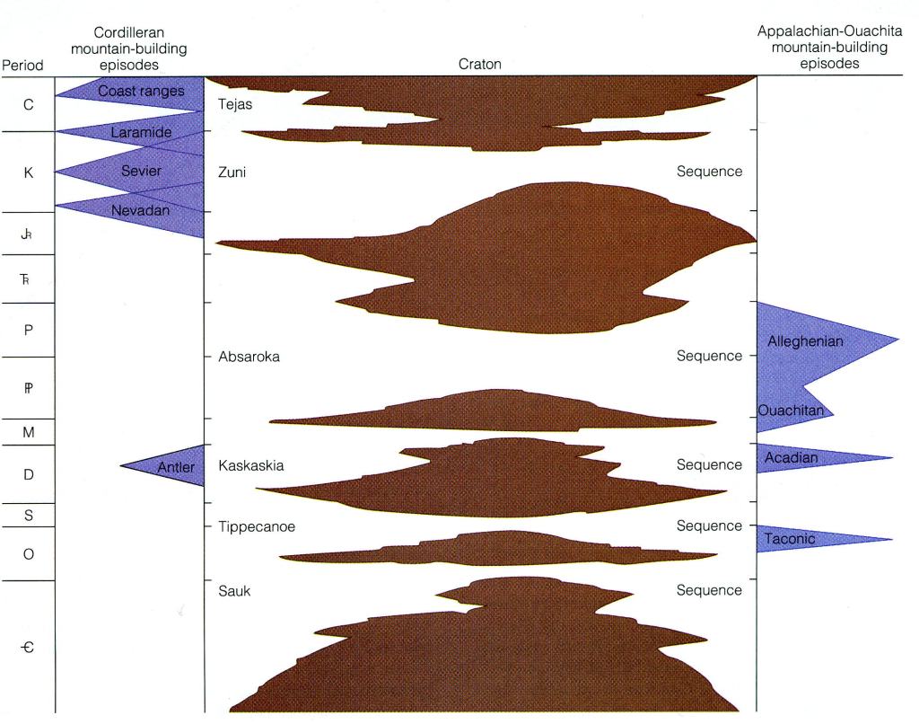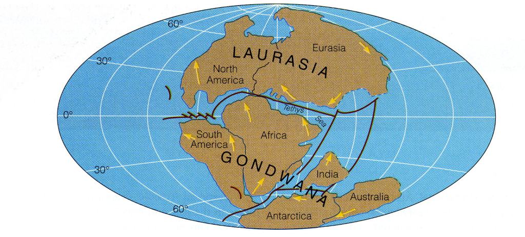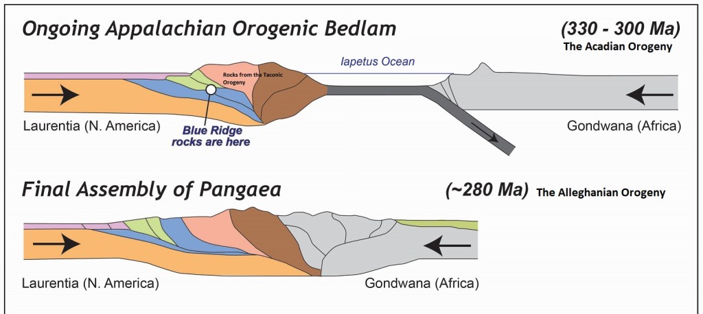 About 500 million years ago, Laurentia and Gondwana began moving toward each other, as if on a slow-motion conveyor belt. They came together in a series of three collisions. First, a strip of crust with volcanic rocks on it, (the Piedmont terrane), collided with Laurentia during the Taconic Orogeny (460 million years ago). [Note that the sandy sediments became quartz-rick gneiss, the muddy sediments became schist, and the basalt layers became amphibolite]. Next, a piece of Gondwana broke off and collided with Laurentia during the Acadian Orogeny (330 million years ago). Finally, Gondwana itself collided with Laurentia, creating the supercontinent Pangea during the Alleghanian Orogeny (280 million years ago).