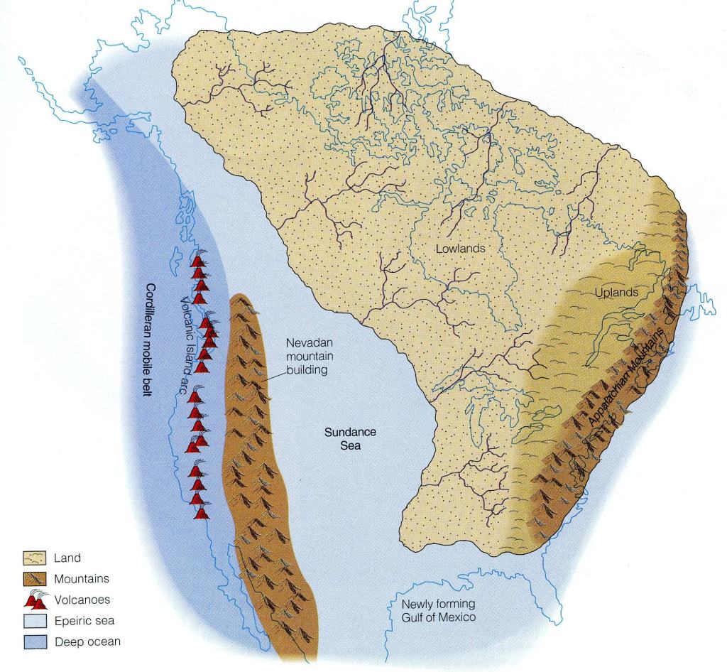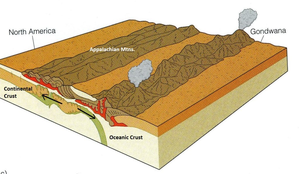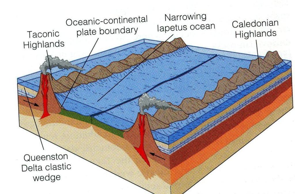 About 460 million years ago, a fragment of crust with volcanoes on it was colliding with Laurentia in an event called the Taconic orogeny & produced most of the Appalachian Mountains, (imaged below).