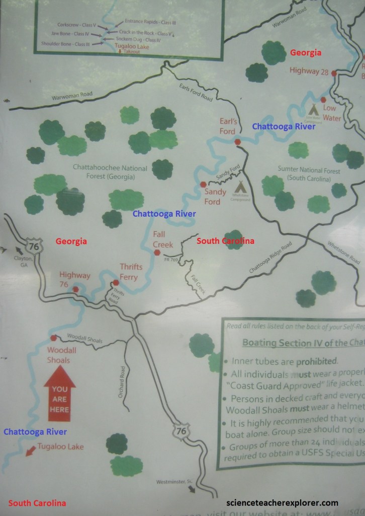 Imaged above, Woodall Shoals was at the Woodall Shoals Boat Launch on the Chattooga River in the Sumter National Forest. The boat launch was at the end of U.S. Forest Service Road 757, a gravel road that branches off of US76 near the South Carolina and Georgia border. [It should be noted that the movie “Deliverance” was filmed near hear on the Chattooga River where it offers some of the wildest white water in the country].