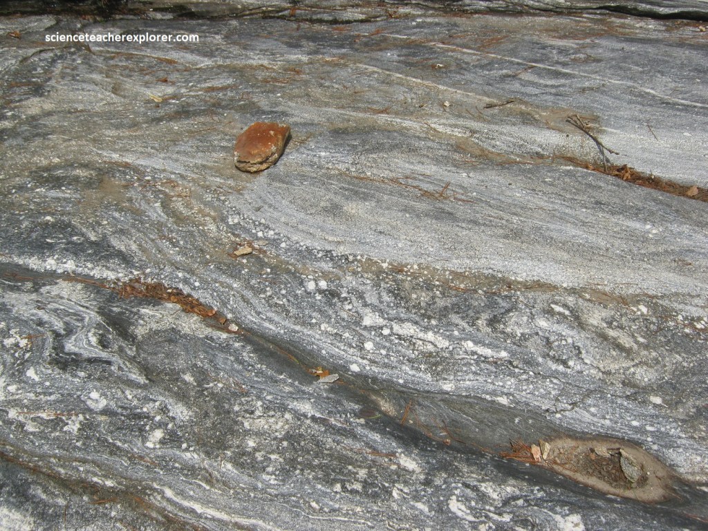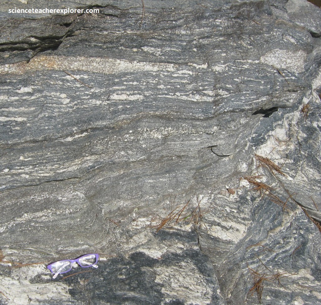Pictured above, near the Caesars Head overlook, the gneiss is weakly metamorphosed and looks very much like granite, (speckled with minerals of different colors distributed evenly throughout and not banded). The more banded appearance of the gneiss, the more metamorphized.