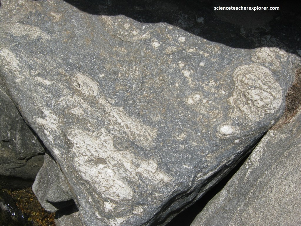Pictured above, the highly deformed metamorphic rocks at Woodall Shoals had been intruded in places by some very coarse-grained quartz pegmatites. These pegmatites form by the crystallization of magma that contains water as well a other elements and compounds that inhibit the nucleation of mineral crystals that cool at a different rate than surrounding magma.