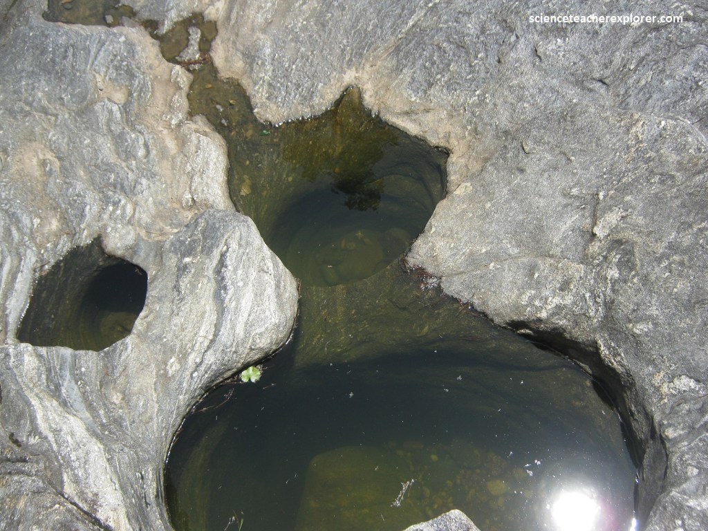 Pictured above, Becky and I found a number of potholes in the rock at Woodall Shoals. These are smooth, circular, deep holes scoured out by waterborne sand and pebbles. Some of the potholes had water in them and others were dry. Most had sand and pebbles in them. When the Chattooga River was high and flowing over these potholes, eddies caused the sediment to whirl around, scouring the holes still deeper.