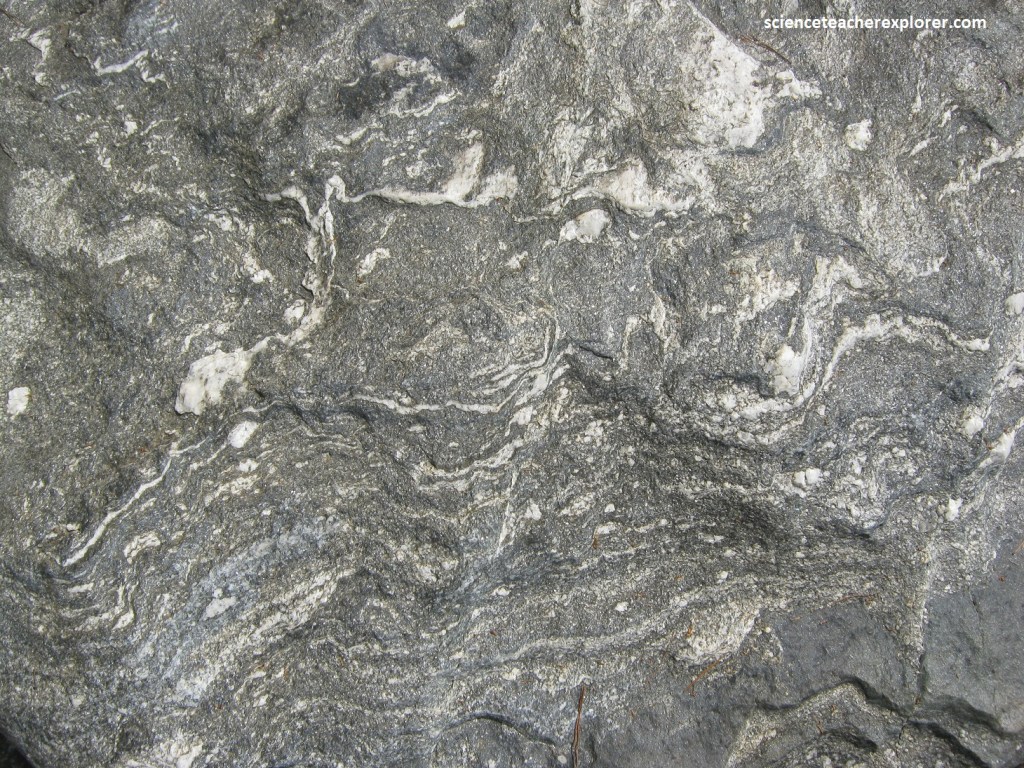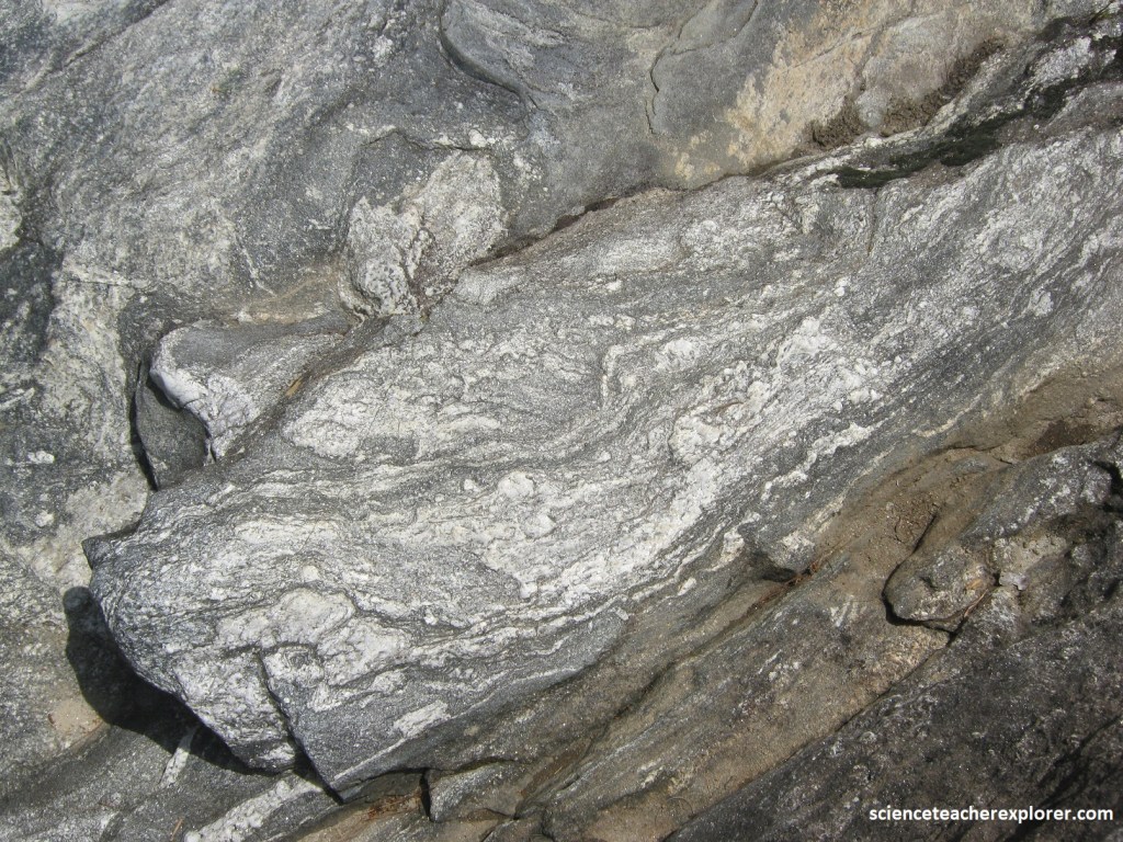 Pictured above, the deformed rock at Woodall Shoals is metamorphic rock; it was the metamorphism that produced the layers, folds, and boudins. Metamorphism is the result of increased temperature and pressure, an the high pressure squeezed the rock into the contorted shapes that I could see at Woodall Shoals. There was schist (fish like scaling), gneiss (light and dark banding), and amphibolite (completely dark).