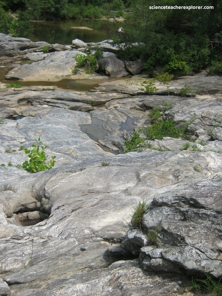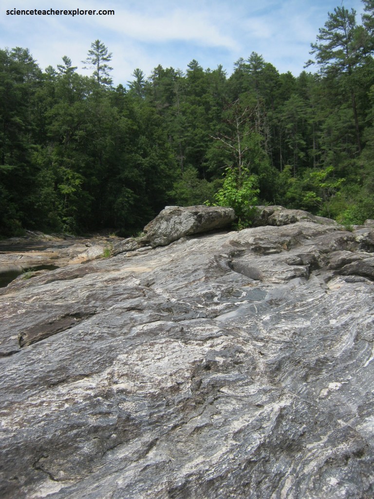 Pictured above, at Woodall Shoals, Becky and I could see light and dark layered rocks that were folded and squished together. There were simple U-shaped folds and more complicated zigzag folds. Some folds were smaller than my hand; others were bigger than my car.