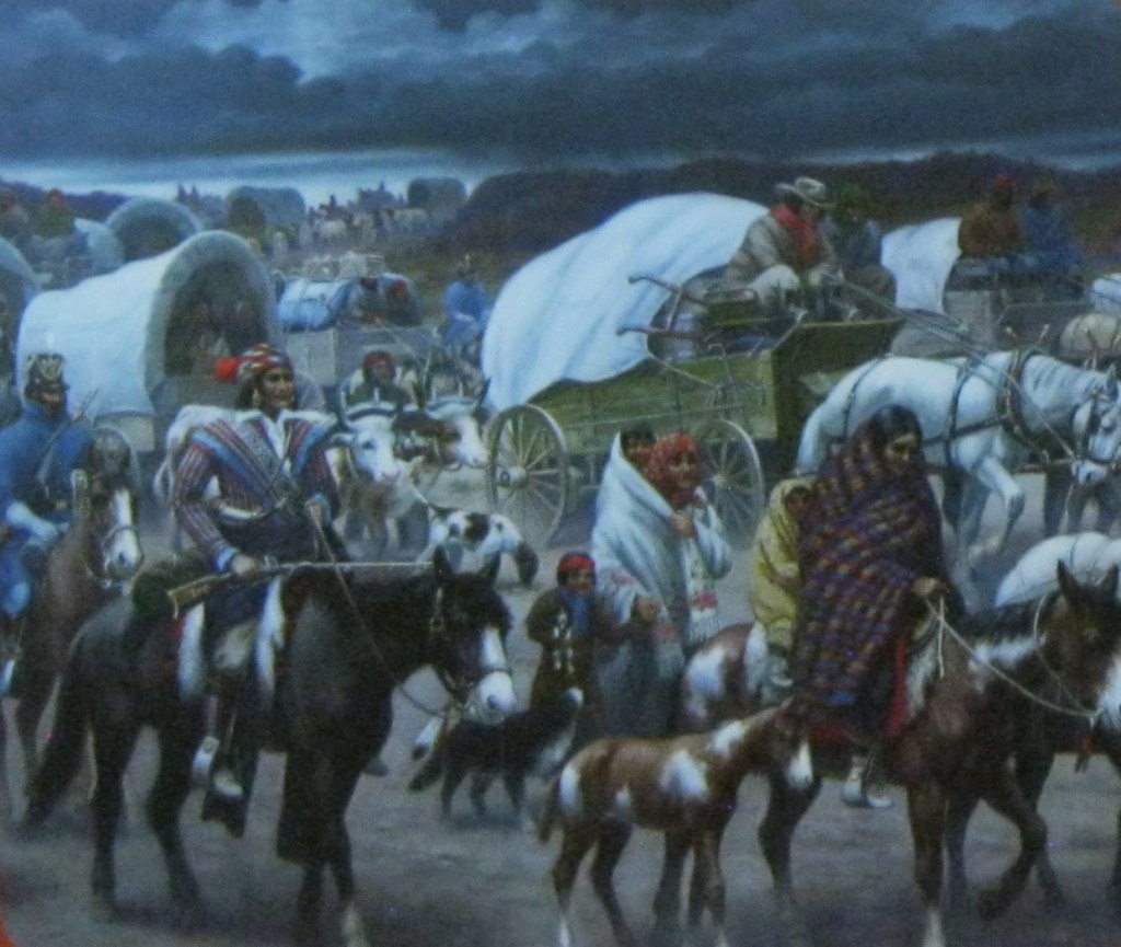 Imaged above, the 1830, Indian Removal Act authorized the forcible relocation of American Natives east of the Mississippi River to the Indian Territory in Oklahoma. The federal government, under pressure from the white settlers, forced more than 16,000 Cherokees to move to Oklahoma. 4000 Native Americans died from exposure, exhaustion and starvation along the “Trail of Tears”.