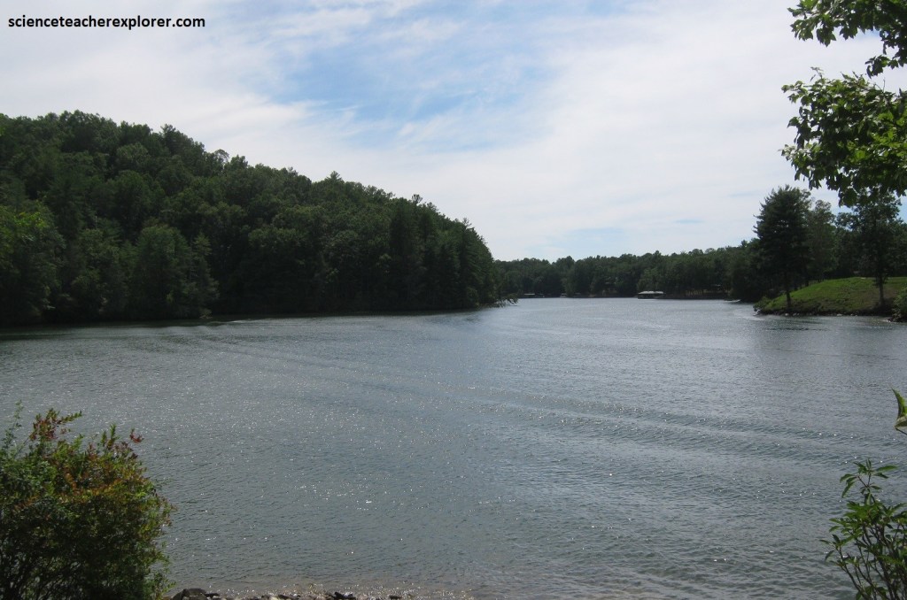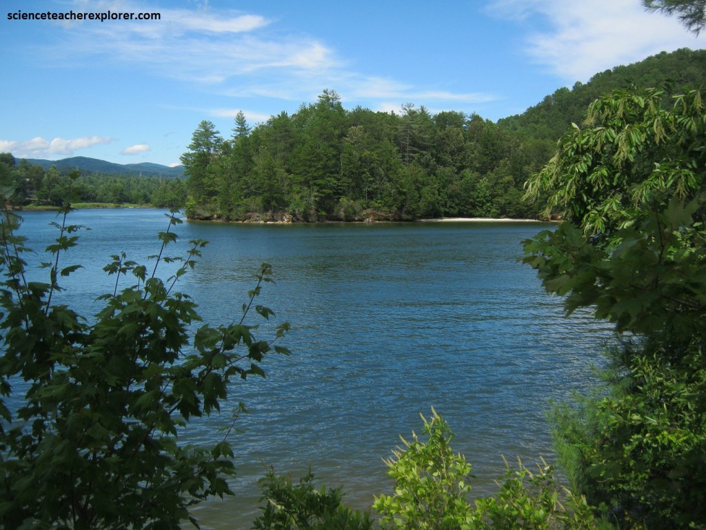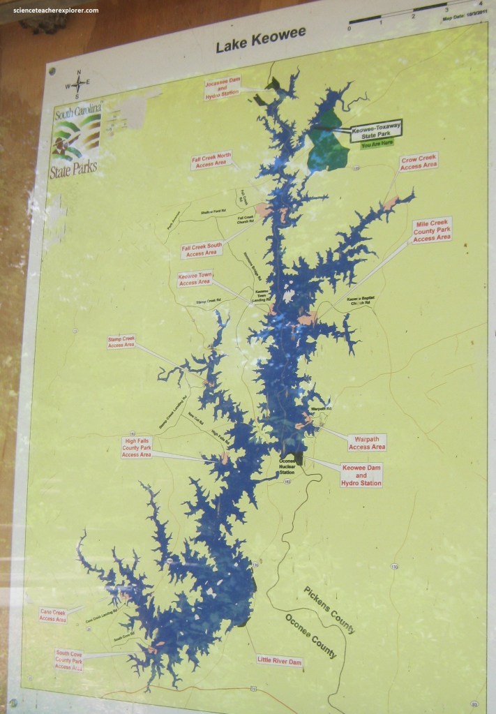 Becky and I continued driving west on SC 11 when we came upon the interpretive center for Keowee-Toxaway State Park. Keowee-Toxaway State Park was a hidden gem in South Carolina’s Jocassee Gorges area. The interpretive center was situated on Lake Keowee with beautiful views of the Blue Ridge Mountains. Here in South Carolina and in North Carolina, they call the Appalachians, “Blue Ridge Mountains”. Actually, the Keowee-Toxaway State Park is in the upper Piedmont, (an area of rolling hills with an average height of (267 – 330)m above sea level).