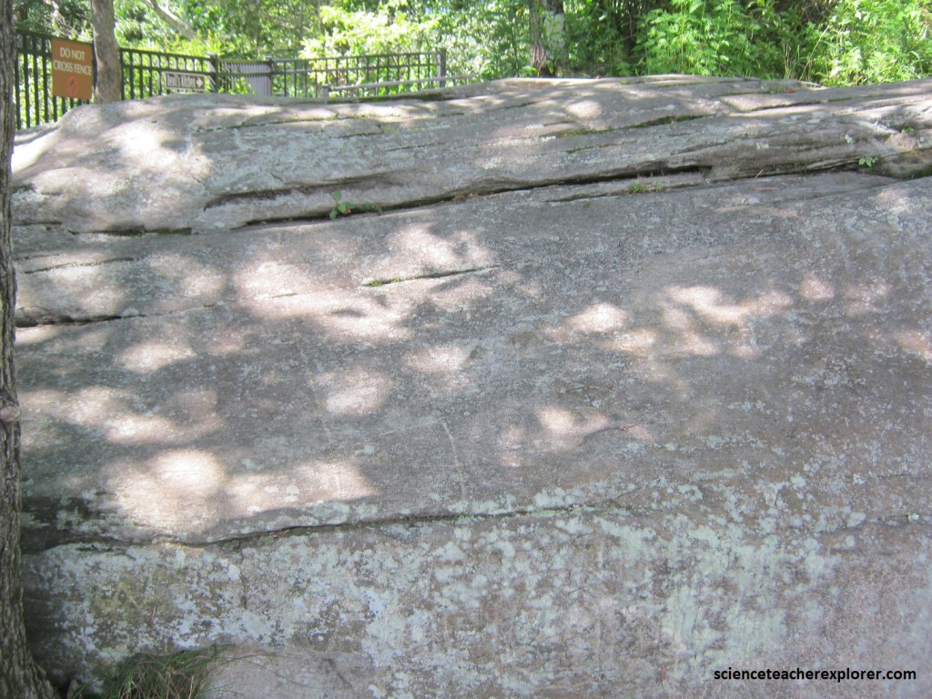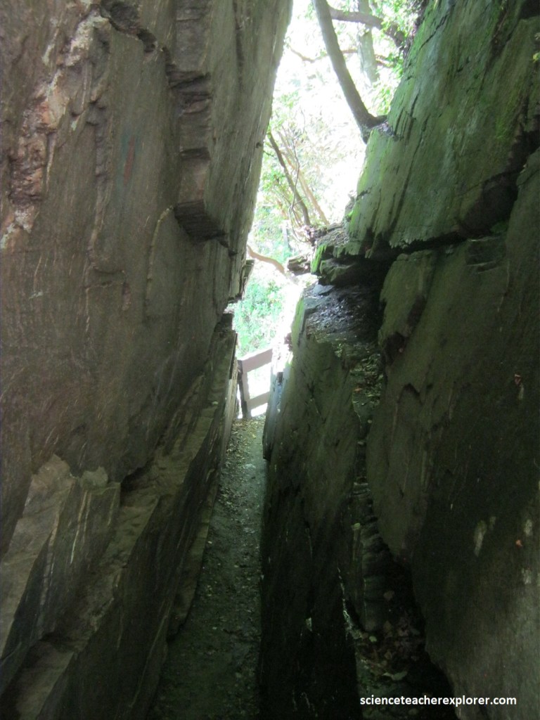 Pictured above, Caesars Head has some pretty impressive cracks in the gneissic granitoid, called joints. [A joint is a crack in rock along which no significant movement has taken place, whereas a fault is a crack along which movement has taken place]. One of the joints near the top of Caesars Head has been eroded into a narrow passageway called the Devil’s Kitchen, (pictured below).