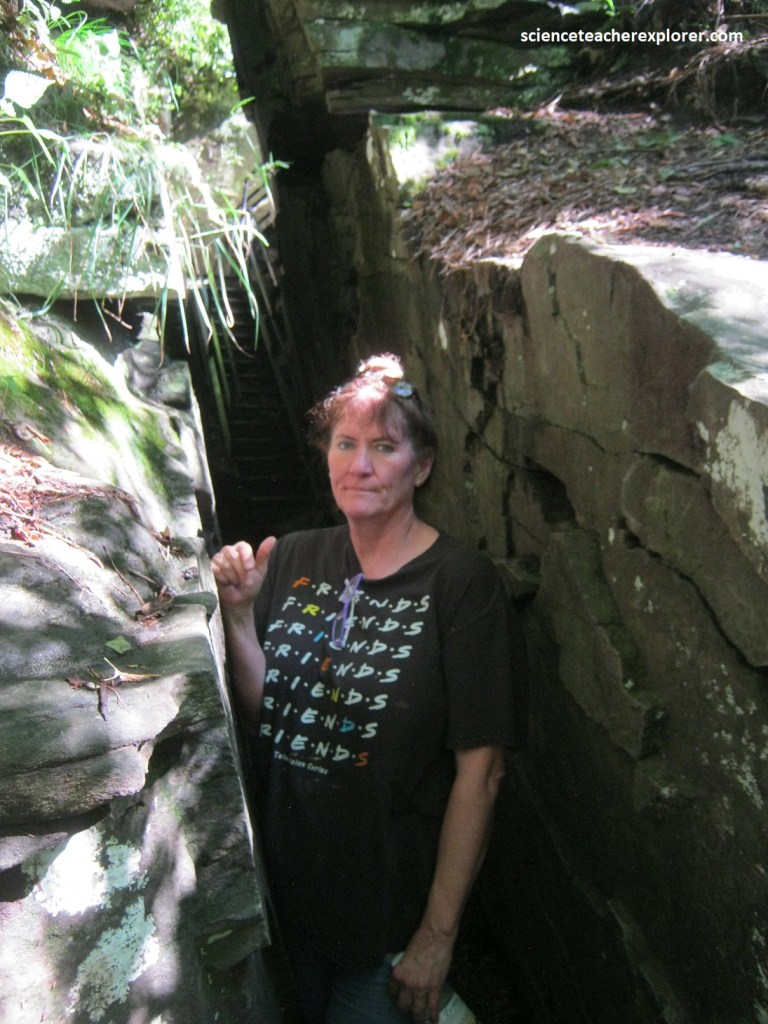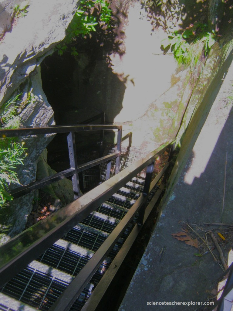 Pictured above, when the “Raven Cliff ” trail reaches Devils Kitchen, a set of stairs descends deep down into the rocky gap, which is just wide enough for a person to pass through.