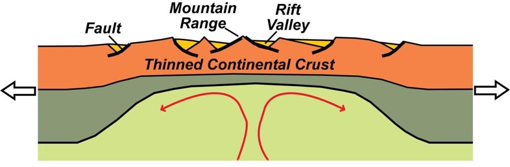 Rift-flank uplifts are long ridges of slightly higher elevation that run along the edges of continents that have rifted apart. When continents begin to rift, the crust gets stretched out and thinned. The edges of the two new continents rise as a result of buoyancy-rebound, and mantle upwelling, (imaged below).