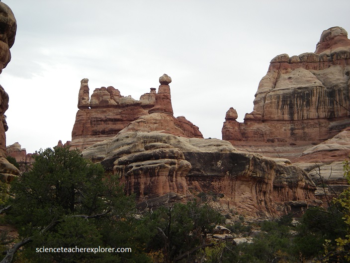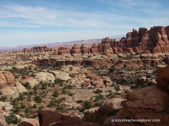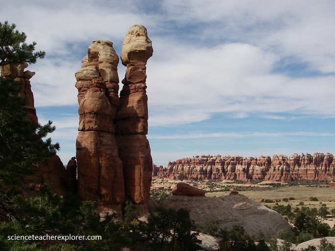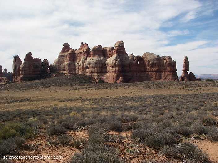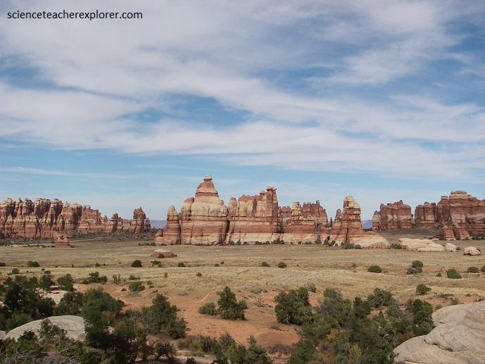 The rocks within the Chesler Park area is of the Permian time period or in Utah it is called the “Cutler Group”. Most of the rocks are reddish brown siltstones, sandy shales and sandstones deposited on oscillating shoreline and interfingered with deposits on beach dunes, in sand bars, and arkosic alluvial fans. The top layer is the “White Rim Sandstone” of which is a white, cross-bedded sandstone deposited in coastal dunes.