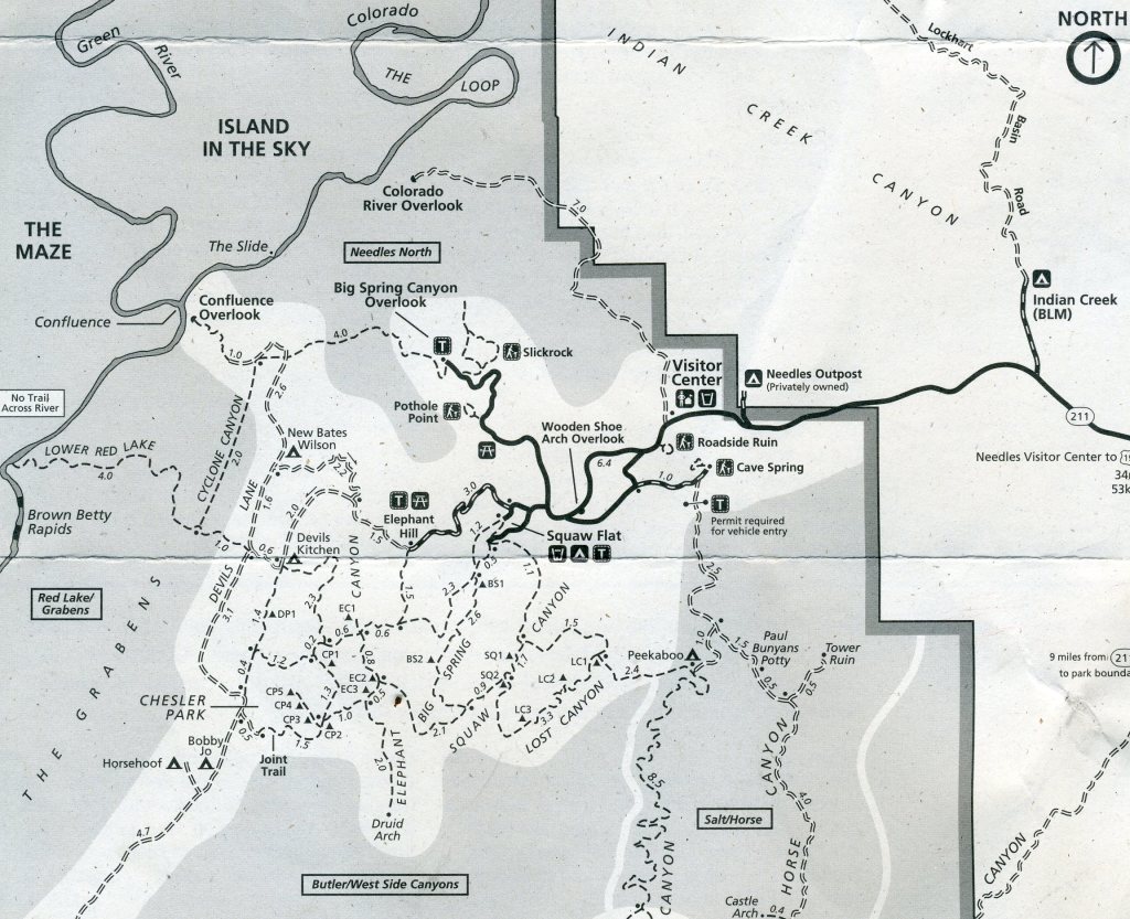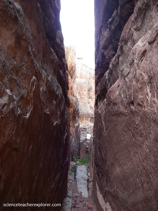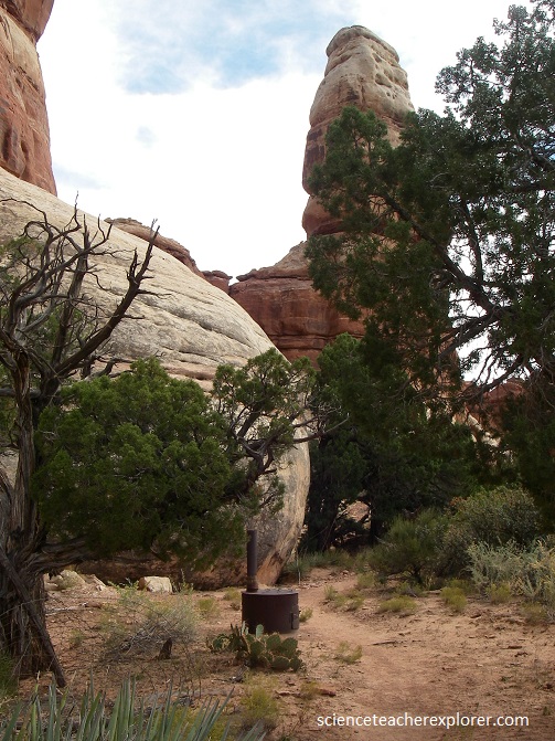Frost action, with its alternate freezing, expanding, and thawing, also breaks up the sandstone. Loose sediment is removed by wind and runoff. The joint spaces gradually enlarge into narrow valley that separate the narrow walls called fins. the Needles themselves are similar to fins but have more cross-cross fractures. Pictured below, the Joint Trail, which goes through a crack in the Cedar Mesa Sandstone, is only a meter wide. It lead me into a great view of the “Needles” and the only way into a hidden valley called the “Virginia Park”.