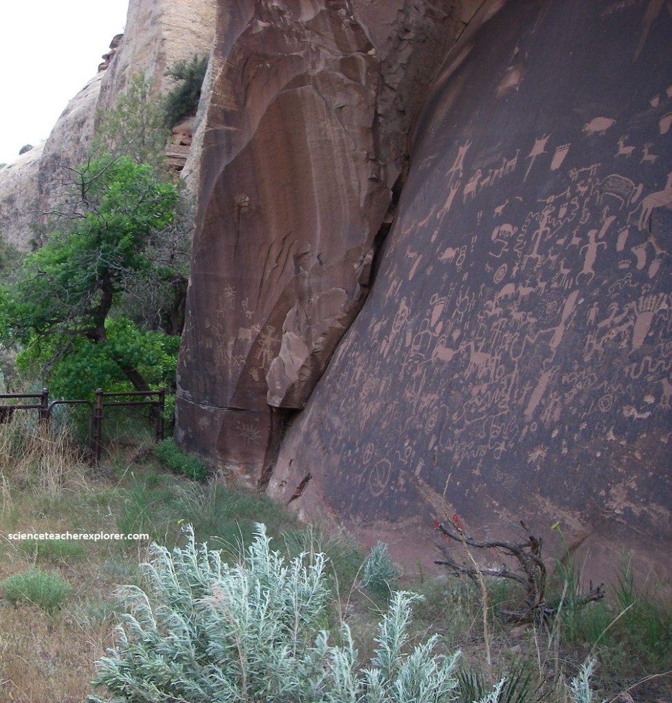 Pictured below, “Newspaper Rock State Historical Monument is a Utah state monument featuring a rock panel carved with one of the largest known collections of petroglyphs. It is along the access road into the Needles district 19 km from US 191 and 48 km from the park boundary. The 19 m2 rock is a part of the vertical Wingate Sandstone cliffs that enclose the upper end of Indian Creek Canyon, and is covered by hundreds of petroglyphs, (one of the largest, best preserved and easily accessed groups in the United States). The petroglyphs feature a mixture of human, animal, material and abstract forms that date from 9000BC to 1300AD.
