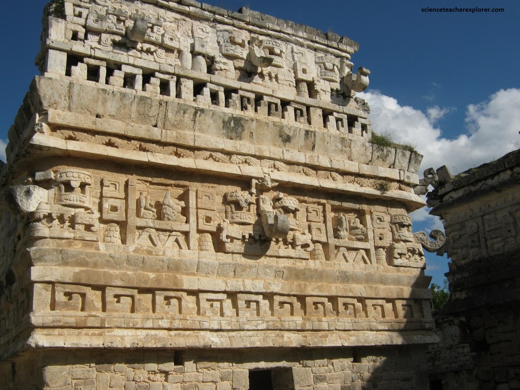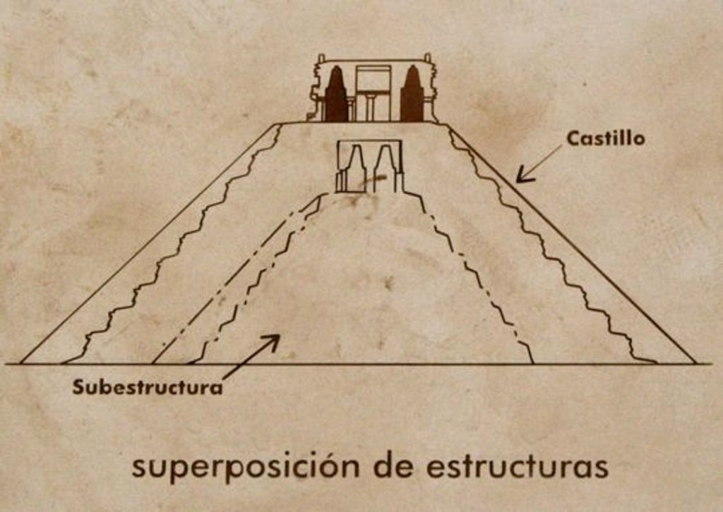 The visible structure covers a smaller earlier one (of similar plan), and some interesting sculpture is found on the inside of the latter. The inner structure was discovered during excavation. A tunnel was cut into the outer structure, and a stairway was located, which is the entrance to the inner structure. The entrance is at the base of the north side of El Castillo, but the inner temple can be visited only during certain hours.