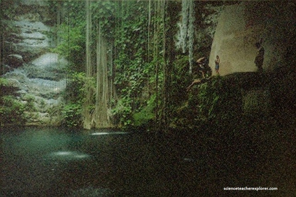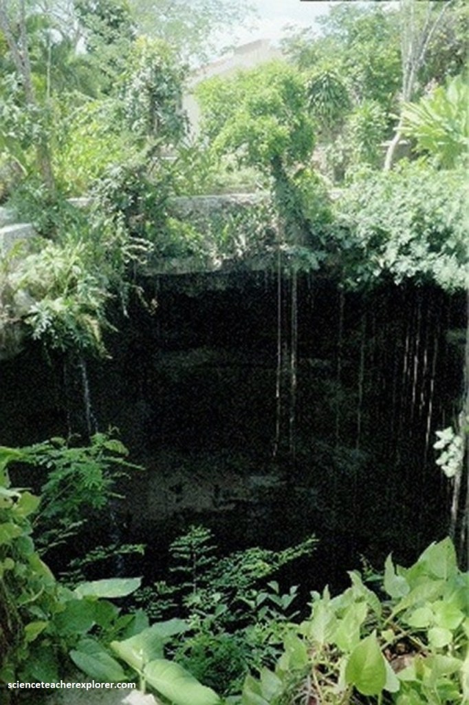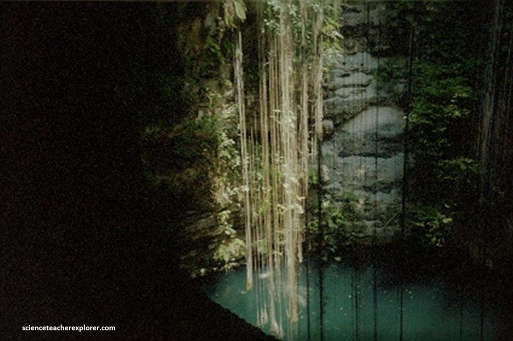 Pictured above, a cenote (seh-NOH-tay) is the Maya term for a natural freshwater sinkhole, a geological feature found in the northern Yucatán Peninsula of Mexico. There are no rivers in the Yucatan; the regular high rainfall (130 cm rain falls every year) simply trickles through its calcareous landscape. Once below ground, the water forms a thin layer of water called a lens aquifer. Those aquifers flow horizontally, carving sinuous underground caves, and when the ceilings of those caves collapse, sinkhole openings to the surface are created, forming a cenote.