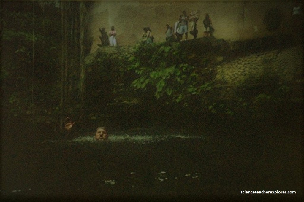 Pictured below, there are vines which reach from the opening all the way down to the water along with small waterfalls. There were blind black-catfish which continually nibbled on my flesh.
