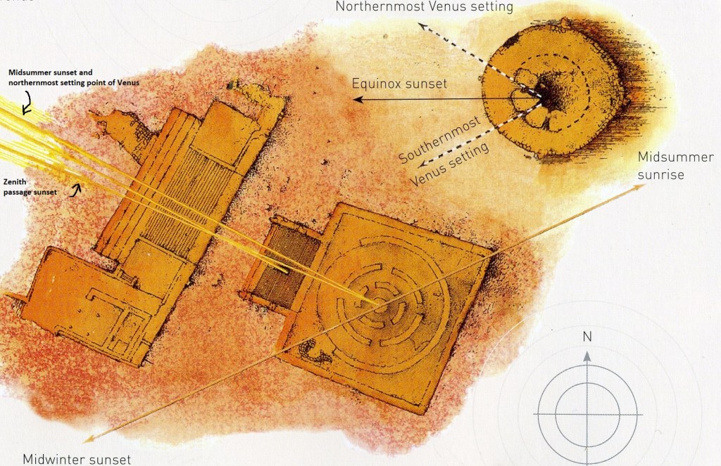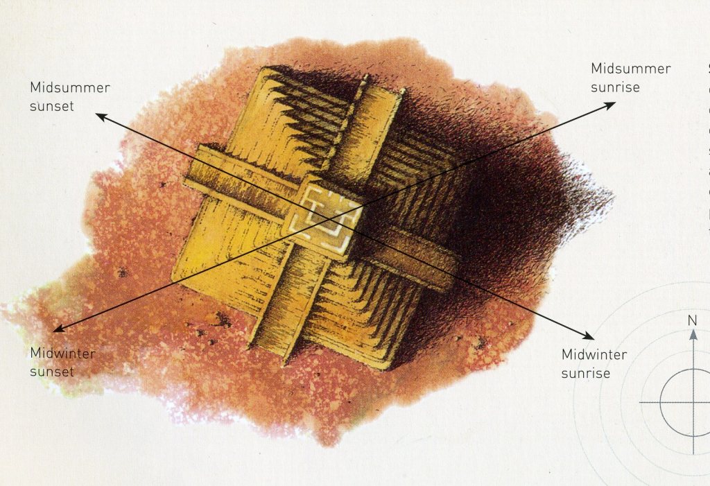 Pictured above, the nine-tiered step pyramid of Kukulcan is 24 m high. A staircase runs up the center of each of the pyramid’s four sides; at the top is a two-story temple. The 91 steps of each staircase, added to teh top platform (4 x 91 + 1), total the 365 days of the Maya year. The square base of the pyramid is oriented to all four solstice directions: the northwest face is aligned to midsummer sunset; the southeast face to midwinter sunrise; and the diagonals to midwinter sunset and midsummer sunrise (image below).
