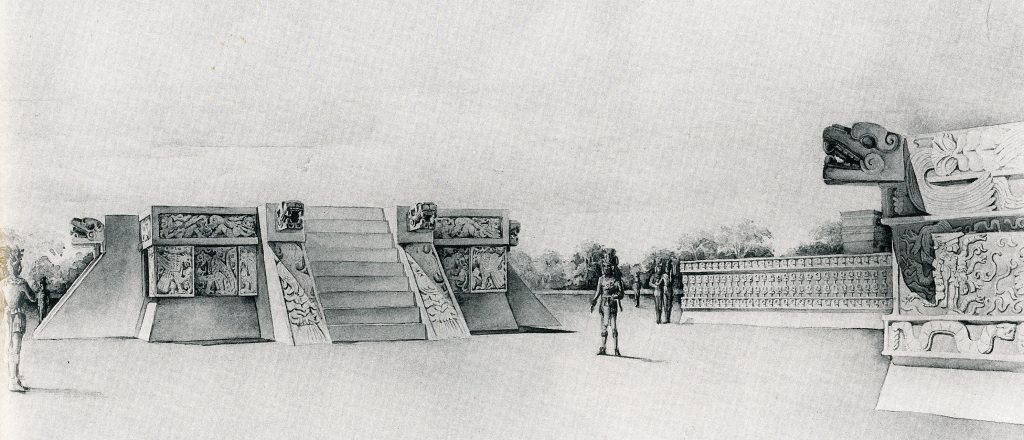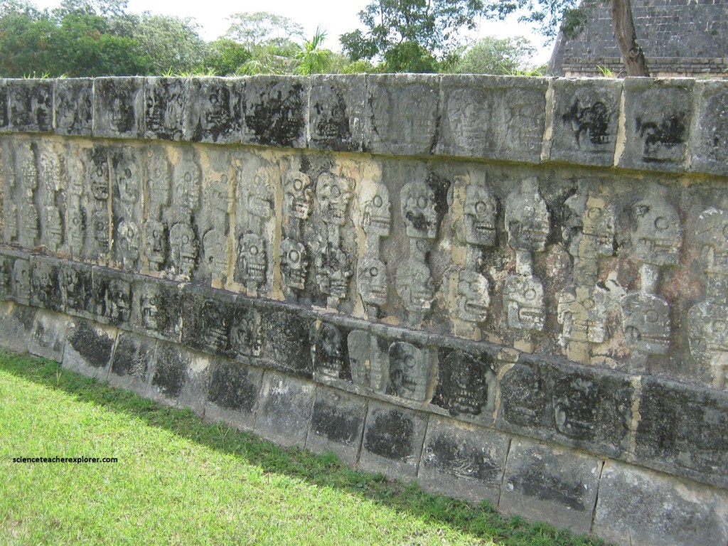 Pictured above and below, Tzompantli is a Mexican word designating a wooden rack on which skulls of sacrificed prisoners were publicly displayed, and it was given to this platform because its lateral wings depict rows and tiers of human skulls impaled on stakes.