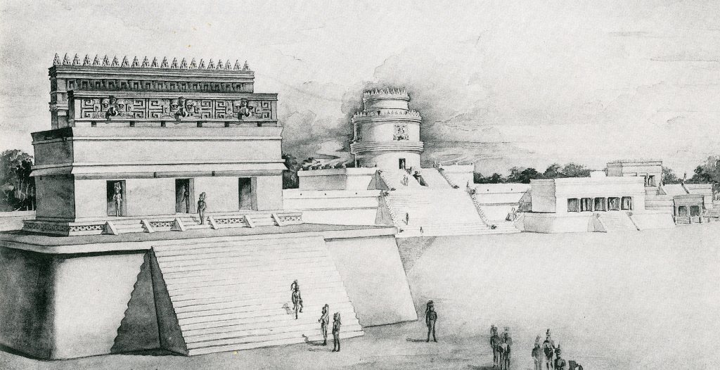 North of these platforms was the skull Rack, or Tzompantli. The sides were covered with bas-reliefs; some depicted skulls in profile, except for the corners, where they were shown full face. Oddly enough, each was different for the other and has its own personality. Other reliefs showed warriors in full regalia, (pictured below).