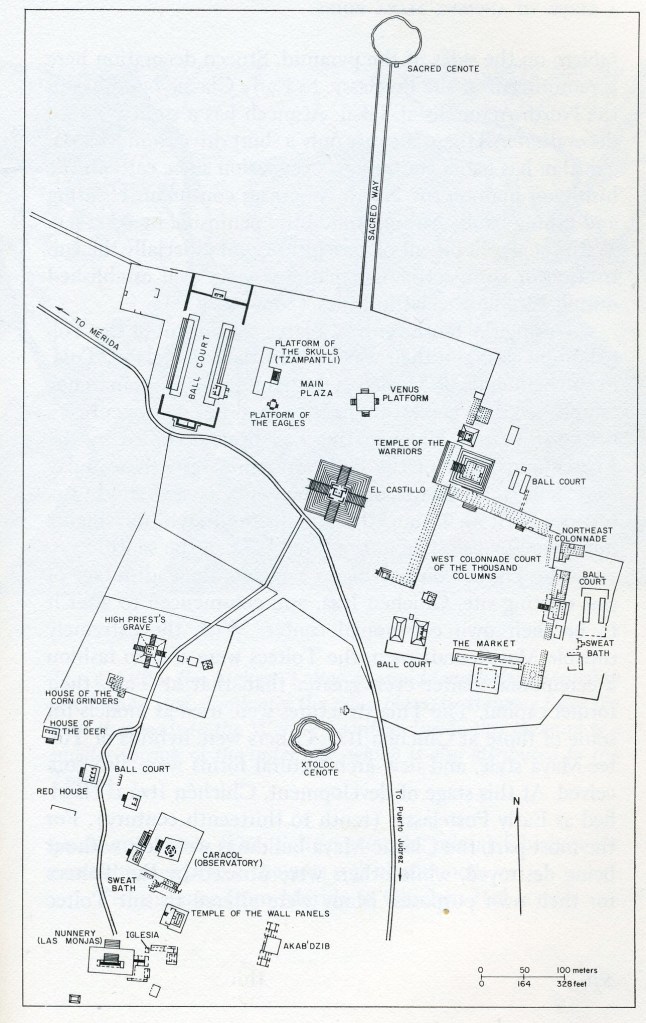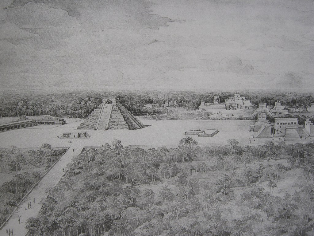 There are two principal styles of public architecture at Chichen Itza. The first is a local variant of the Puuc style found at sites in west-central Yucatan and northeastern Campeche [This architectural style began at the end of the Late Classic period (840 A.D.) but experienced its greatest extent during the Terminal classic period (1100 A.D.)]. The other style is partly derived from the same roots but is vastly enriched by elements and concepts from other parts of Meso-america, notably the Gulf Coast, Oaxaca, and central Mexico. Investigators of Chichen Itza proposed the Puuc-style were “Maya” and the features found (serpent-deco, Chac-Mools, warrior-successions) in the other style were “Toltec.”
